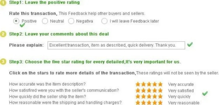 We leave positive feedback for you after receiving payment. Your feedback is very important for us, positive feedback and 5 Score DSR is highly appreciated.