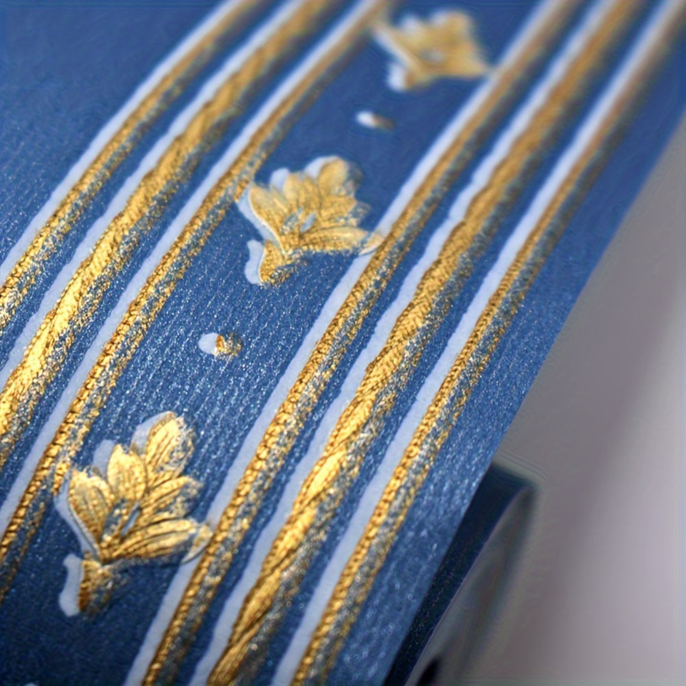 This product is made of non-woven material in beige and blue colors, featuring a modern style with a wavy curve stripe pattern. Each roll covers an area of 5.3m2 (57sq.ft). It is recommended to buy rolls from the same batch to avoid color discrepancies. Please ensure to calculate the required size before making a purchase. Please note that there may be slight variations between the picture and the actual product due to lighting, display settings, and other factors. The actual product color may slightly differ.
