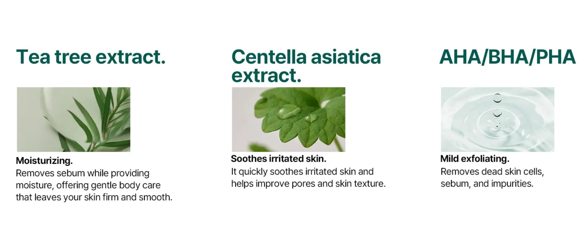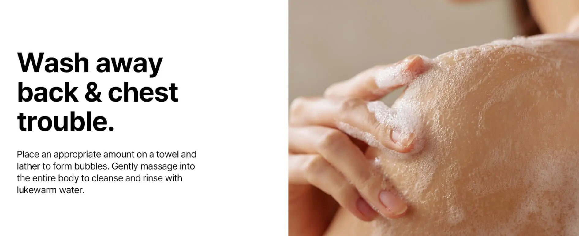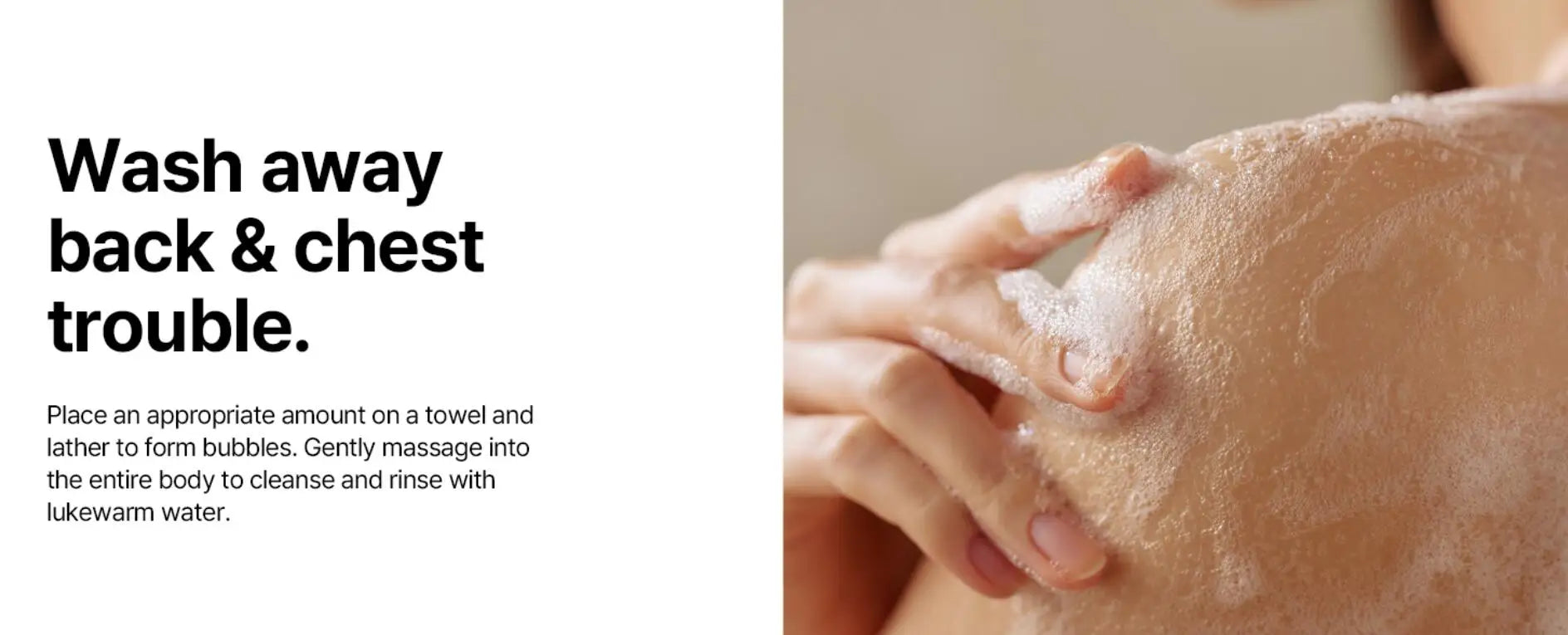 MIRACLE BODY CLEANSER : This body cleanser is specifically designed for Body Acne skin and contains AHA, BHA, and PHA, which helps to remove dead skin cells, sebum, and skin waste. The product's micro-bubble technology is effective in cleansing pore waste, while natural cleansing surfactants are used to protect sensitive skin. Additionally, the product is free of 20 types of artificial ingredients and has been dermatologically tested for sensitive skin