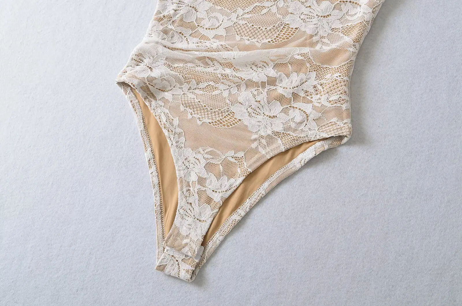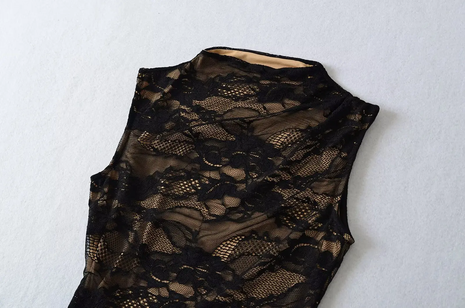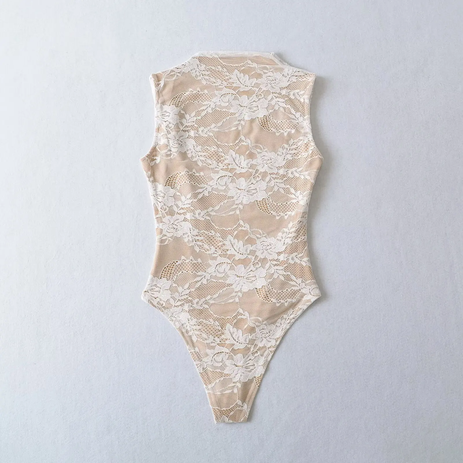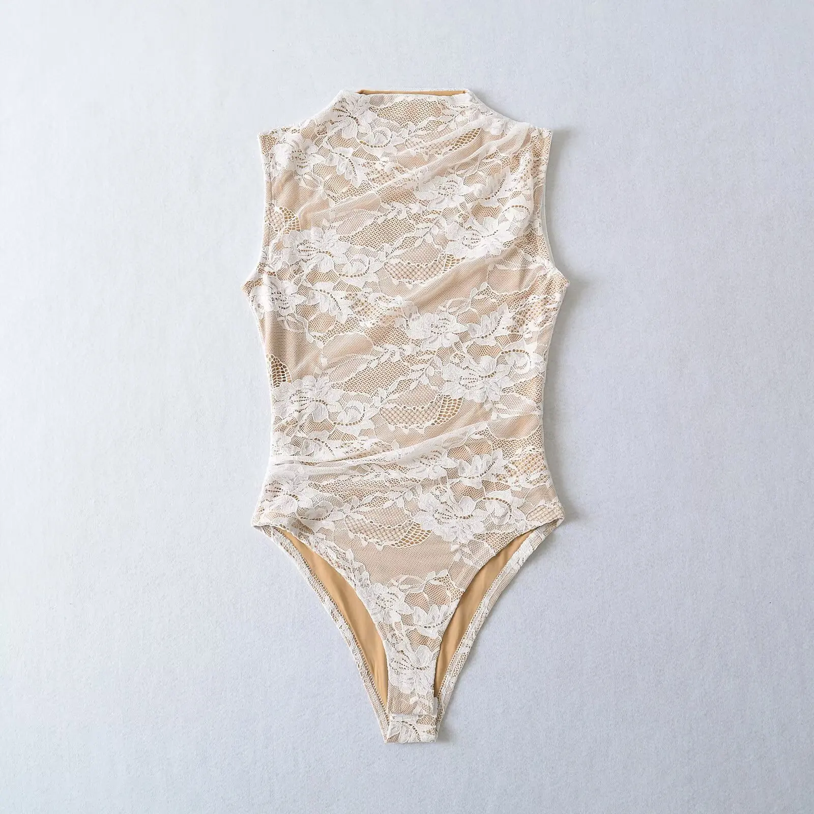 Fall 2025 color-blocked lace bodysuit, high neck, sleeveless, sexy
