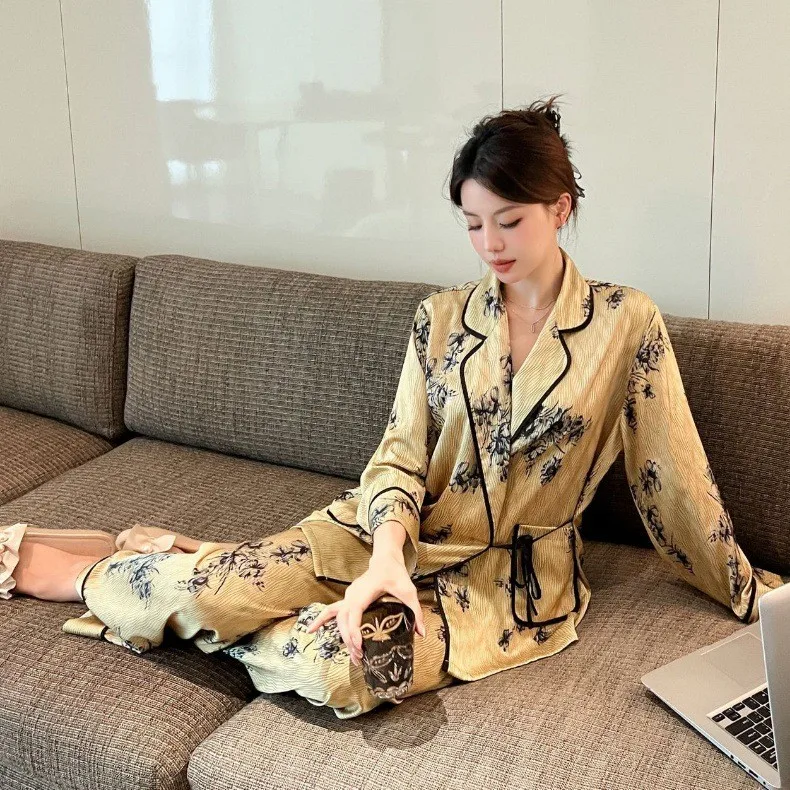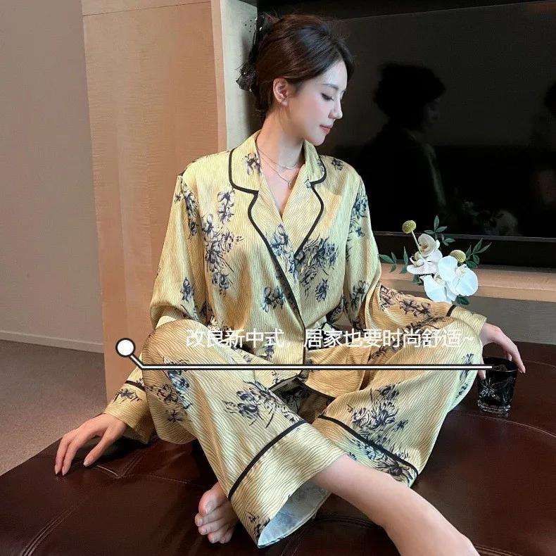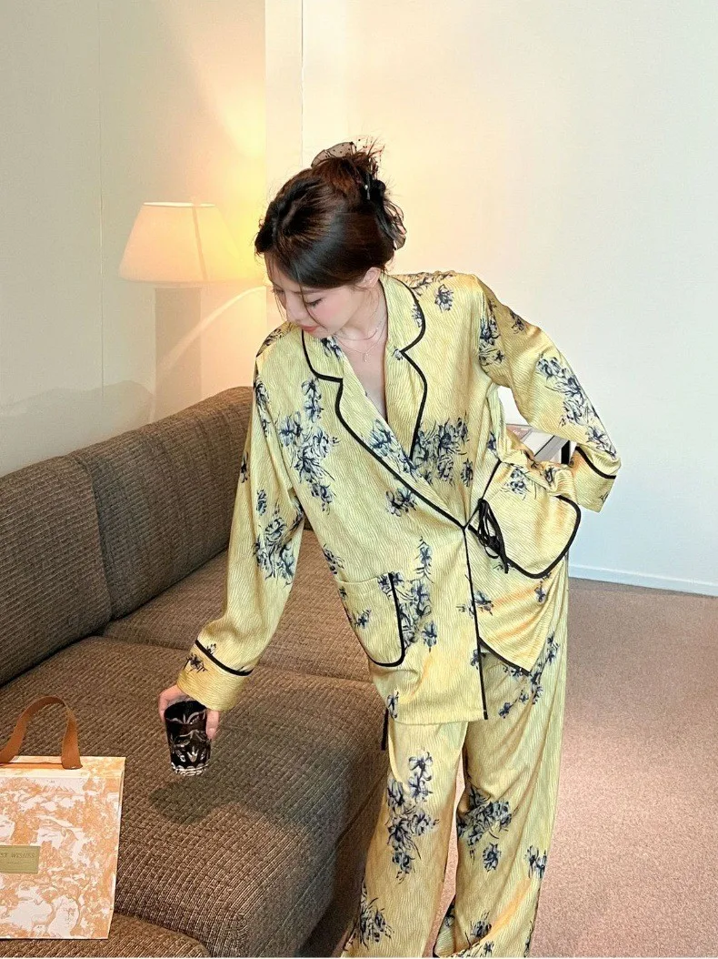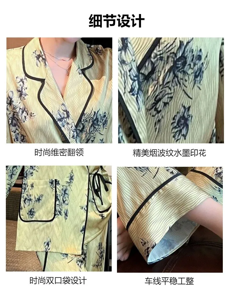 2024 Autumn women's silk pajamas Satin long sleeve pants two-piece sleepwear Fashion printed green fruit collar home wear |