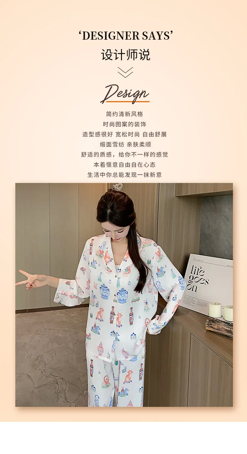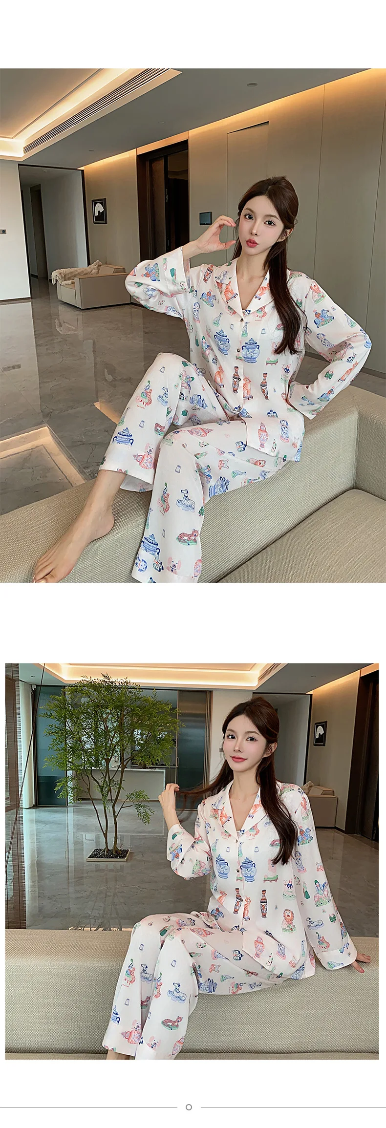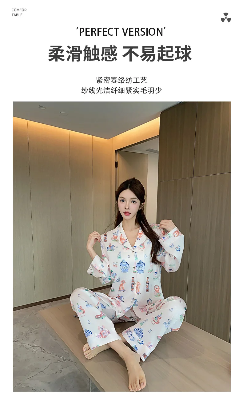 2024 spring new women's silk pajamas pink cartoon print long sleeve trousers sleepwear casual satin plus size home wear set |
