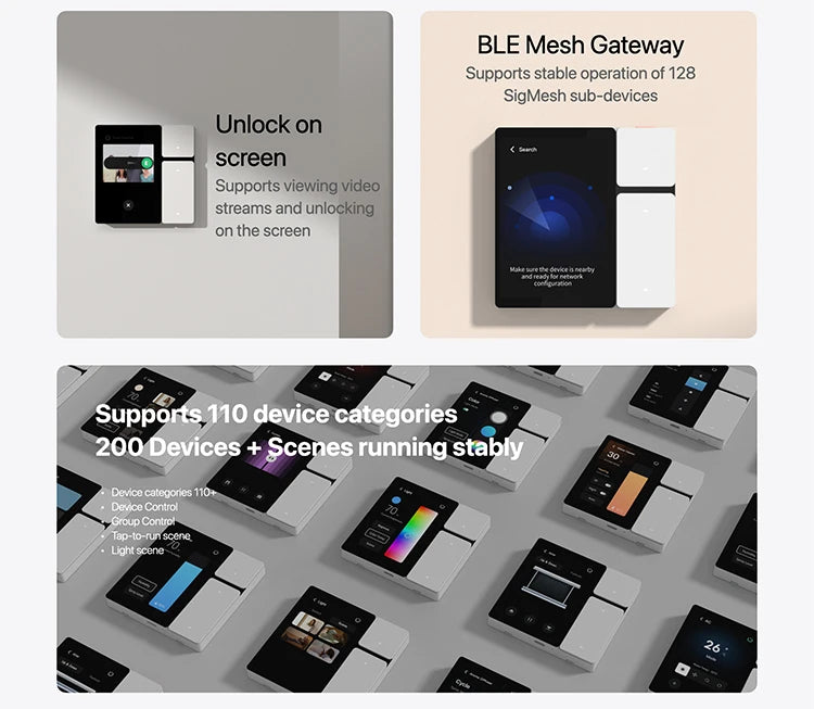 4 inch smart home control panel,10.1 inch touch screen control panel,5 inch smart home screen,3.5 inch touch screen switch with scene function,4 inch touch screen 3 Gang relay switch & scene panel 2 in 1 ,smart dimming controller, Zigbee & BLE hub gateway, PIR and microwave sensor WIFI/ZigBee, Smart Video door phone, Knob Dimmer Switch,Temperature and humidity + light sensor, Smart ZigBee Switch and related series of accessories.