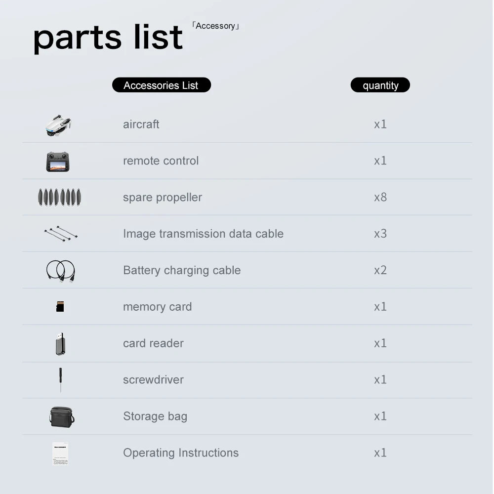 • **Enhanced Control & Connection** – The remote controller features a 4.5-inch high-resolution display for real-time FPV (First-Person View) flying. Supports 5G frequency for stable, high-speed data transmission. Comes with rechargeable batteries, multiple propellers, USB cables, screwdriver, manual, card reader, and SD card for comprehensive setup and operation.