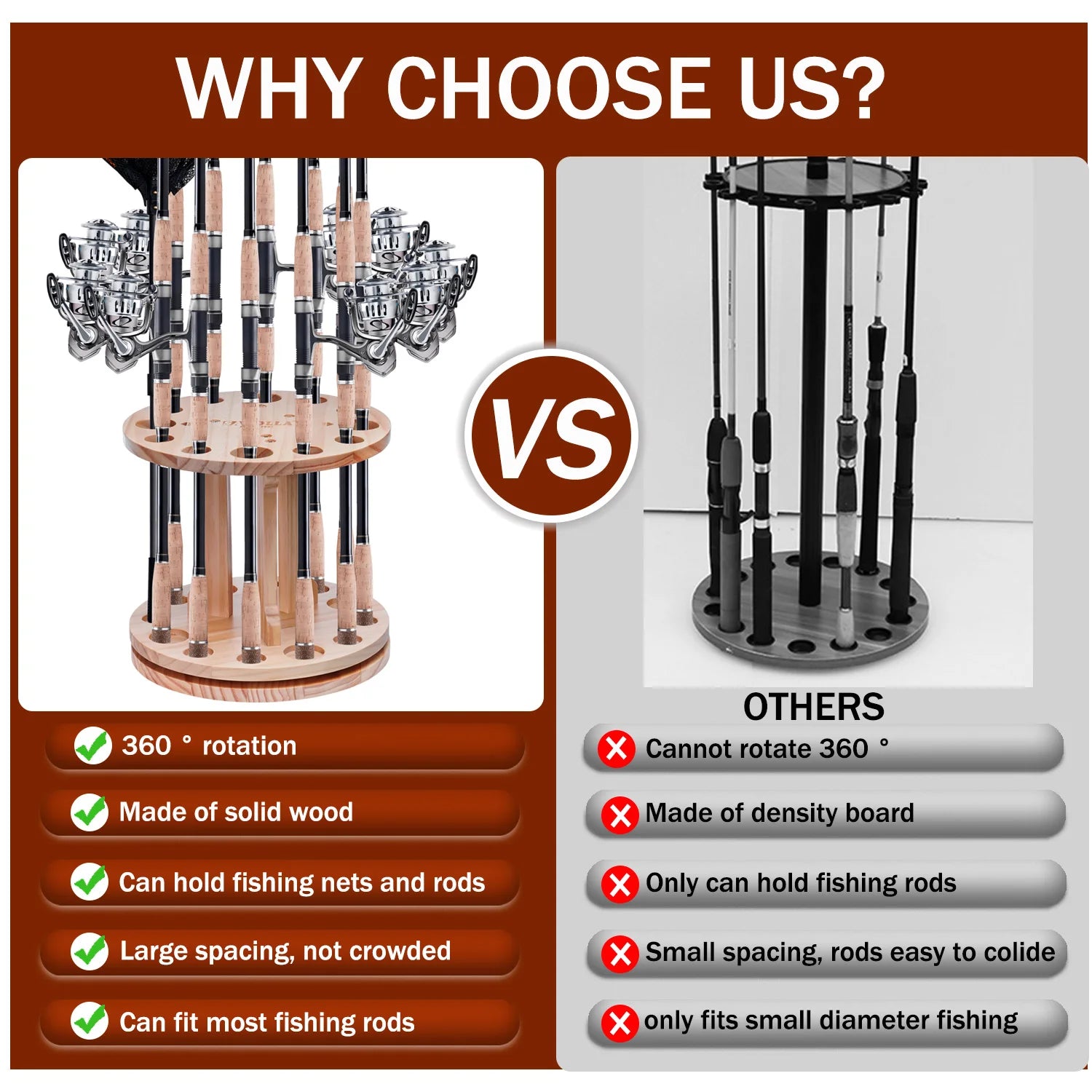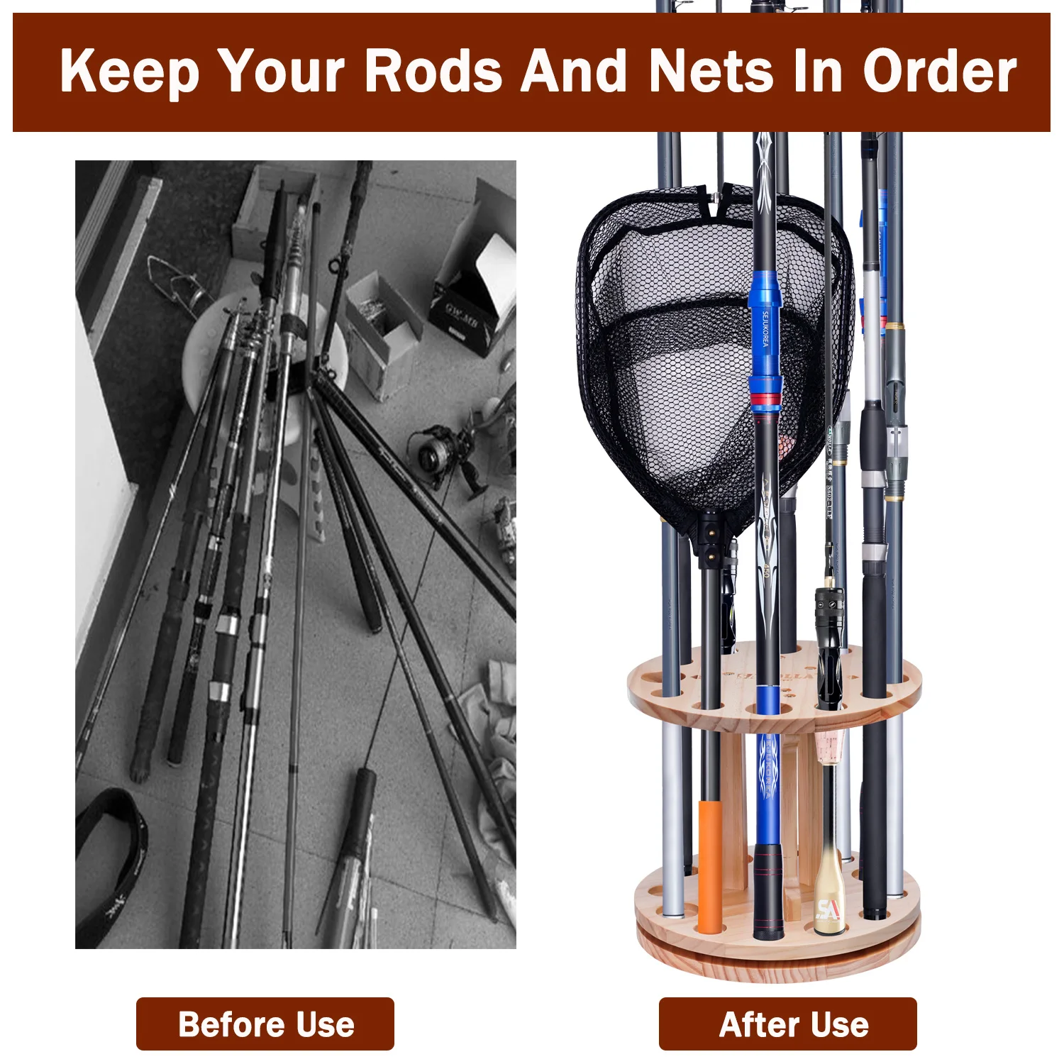 360° Rotation Wooden 12 Slots Round Fishing Rod Holder Upgrade And Strengthen Space Saving Storage Organizer Roove Fishing Gear