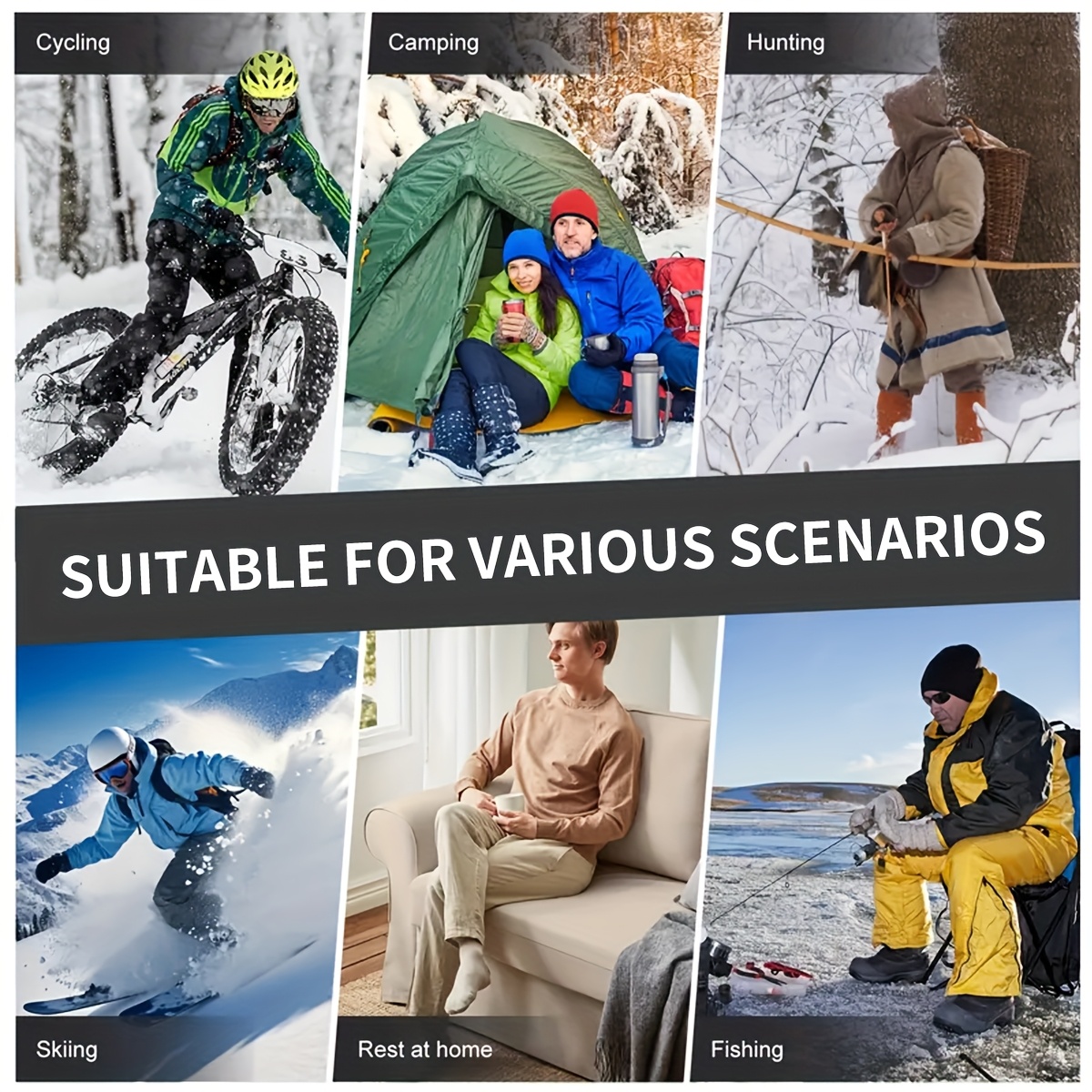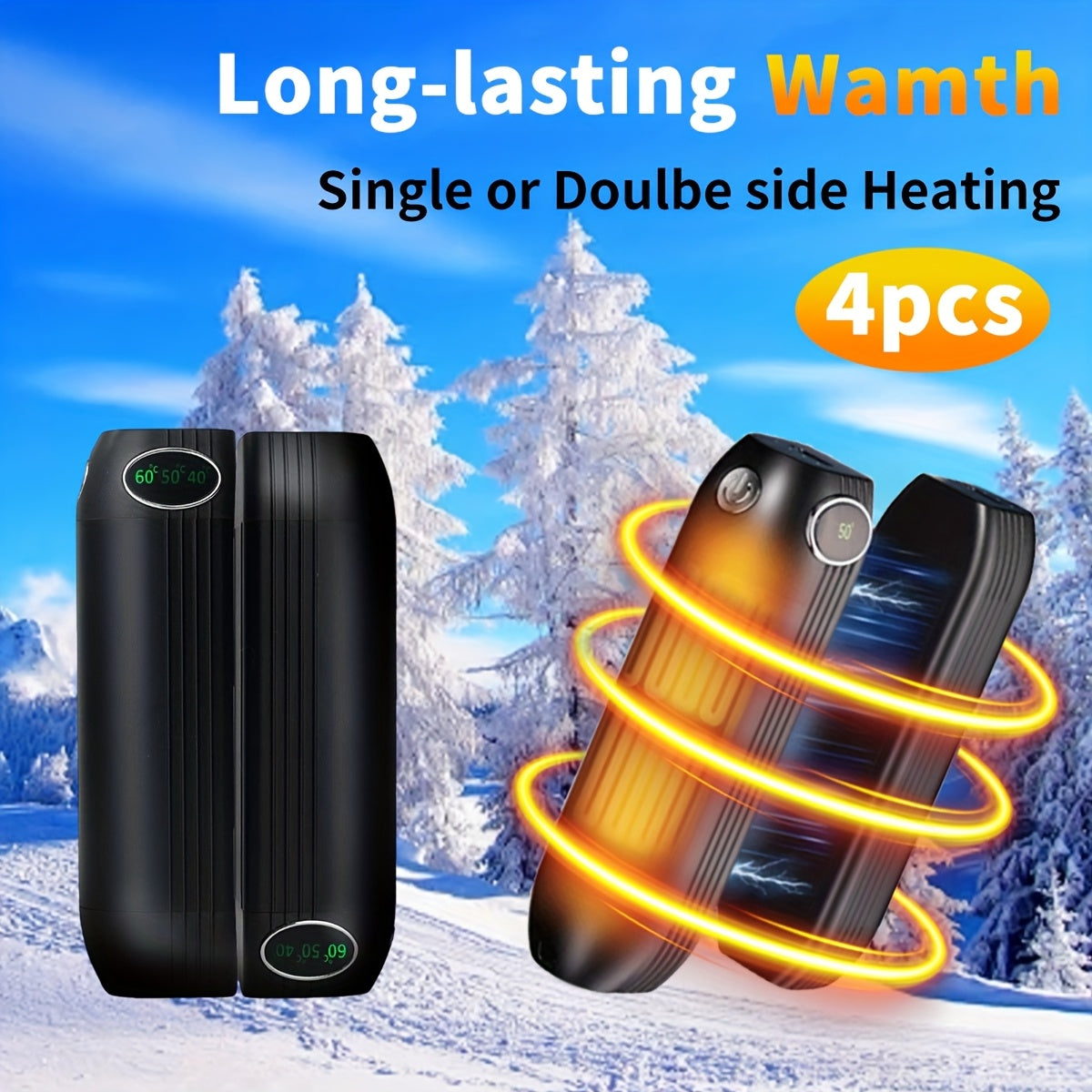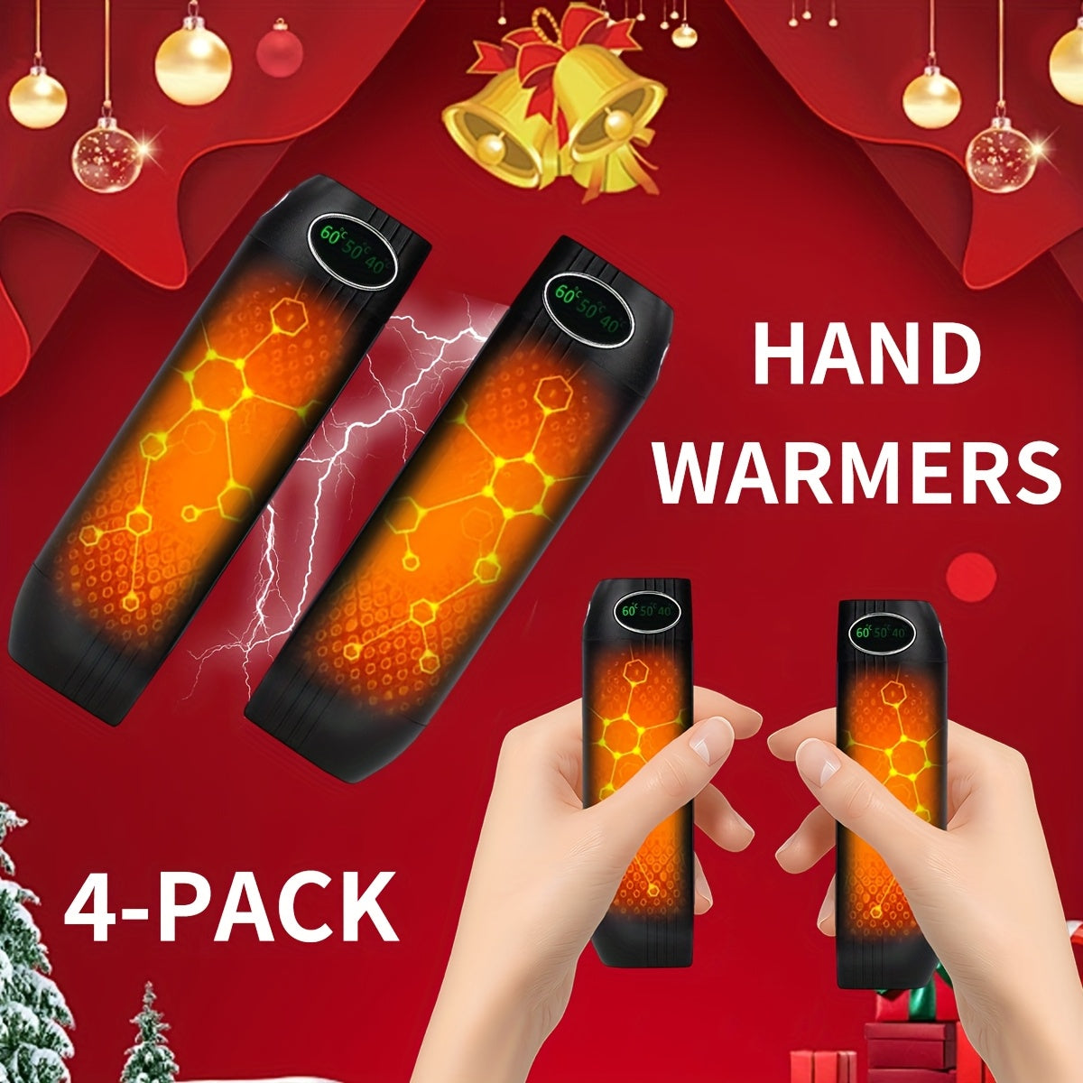 Set of four rechargeable hand warmers, featuring a 5000mAh capacity for hands-free heating, providing warmth for up to 40 hours with three adjustable heat levels. Convenient to carry, ideal for activities like hunting, golfing, camping, and other outdoor pursuits, making them great gifts for Black Friday, Halloween, Christmas, and New Year.