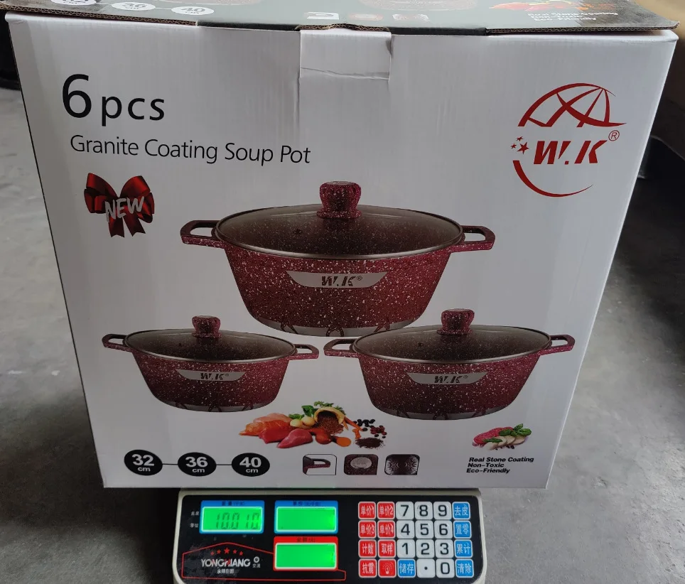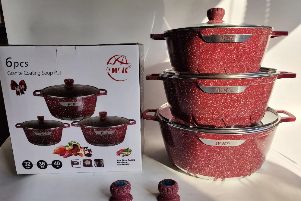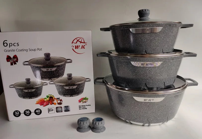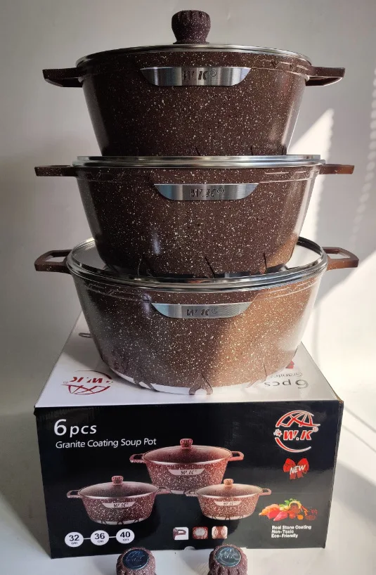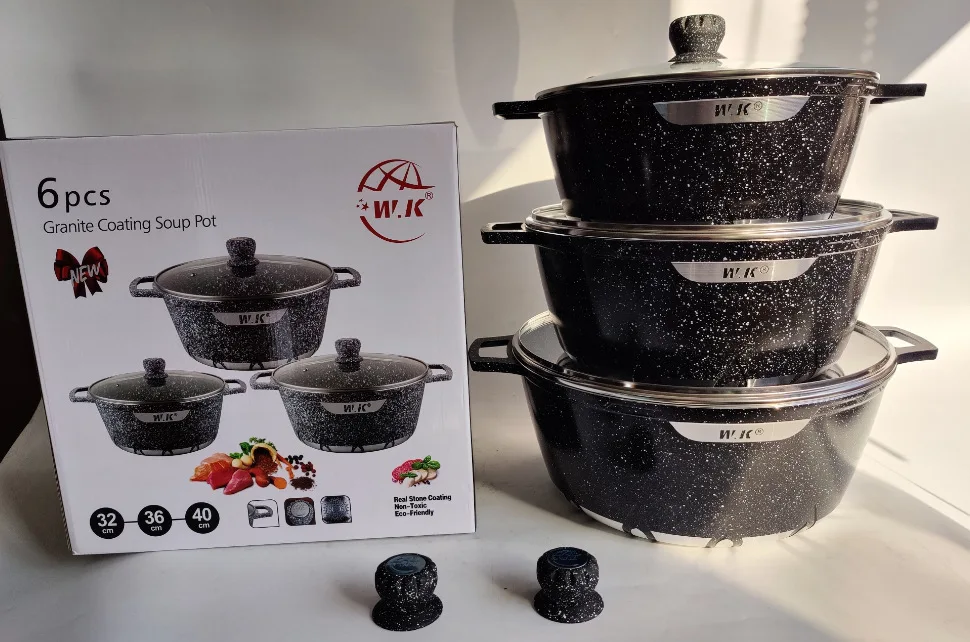 Refresh your kitchen with this set of 6 modern cast aluminum pots, unique sword-shaped design with a strong Middle Eastern feel. Durable cast aluminum material, high-quality marble-granite non-stick coating helps you cook delicious soups and broths without worrying about sticking to the bottom. Various sizes 32/36/40 suitable for all family cooking needs. Sturdy handle, tight lid to prevent overflow, easy to clean. The product is an ideal choice for those who love convenience and luxury in their kitchen!