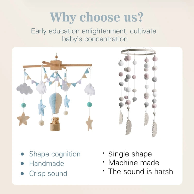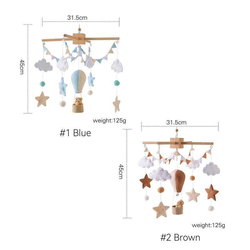 Welcome to the magical world of Baby Crib Wooden Pinwheel! This special product is not only a lovely toy but also a close friend for your baby's sleep. With a lovely hot air balloon design and safe natural wood material, the pinwheel brings gentle sounds, helping your baby relax and fall into a peaceful sleep. Let your baby explore sweet dreams with this wonderful hot air balloon stuffed animal!