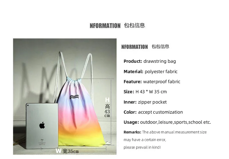 Custom eco friendly drawstring backpack with zipper pocket, colorful, waterproof, printed, polyester lined, logo display - gift