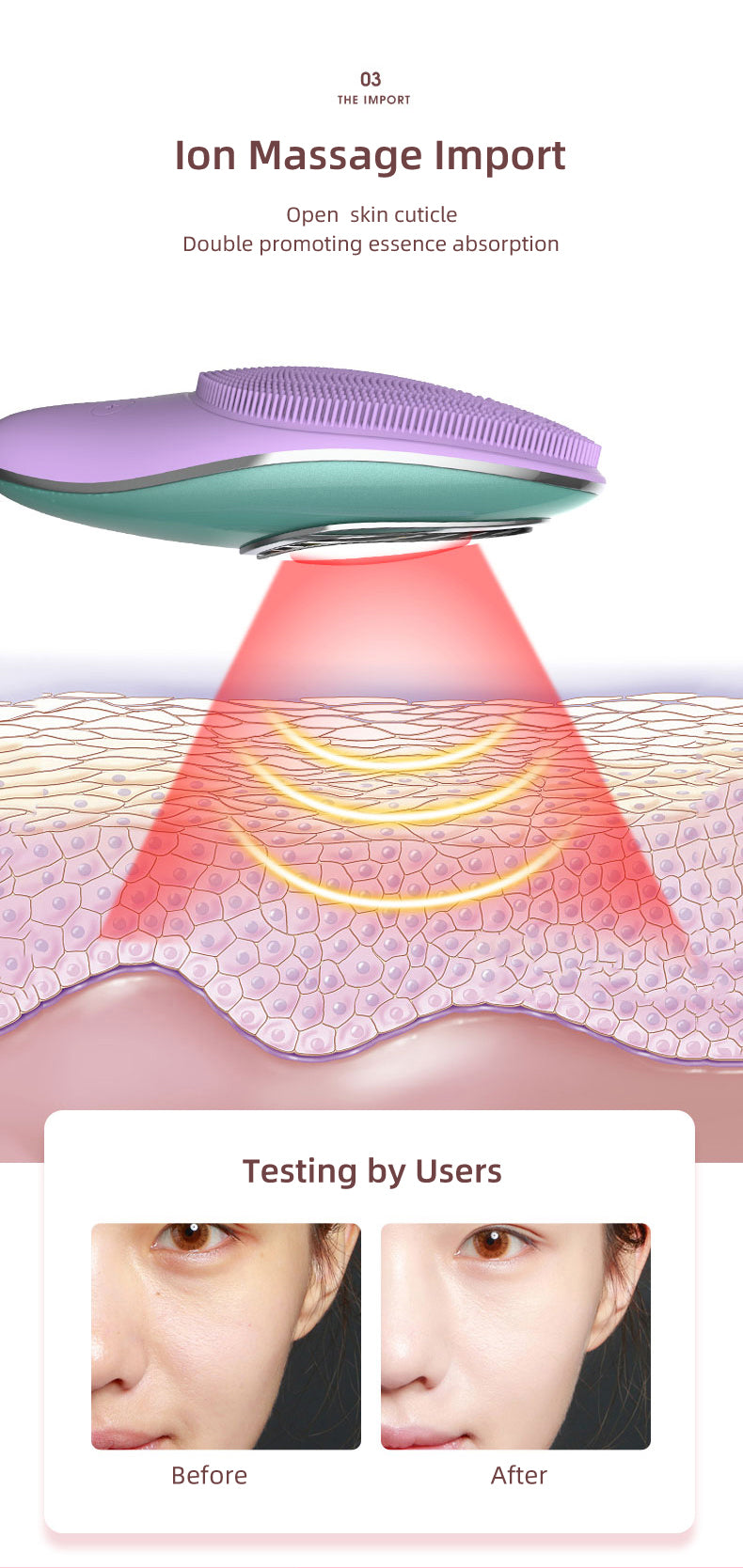 1. Sonic vibration, deep pore cleansing and facial massage 2. Red light treatment combined with positive ions and vibration, removes impurities in pores. 3. Yellow light treatment combined with negative ions and vibration, promotes the absorption of eye cream, whitens and rejuvenates the skin. 4. EMS (Electrical Muscle Stimulation) plus red light therapy for skin tightening 5. Full body waterproof |