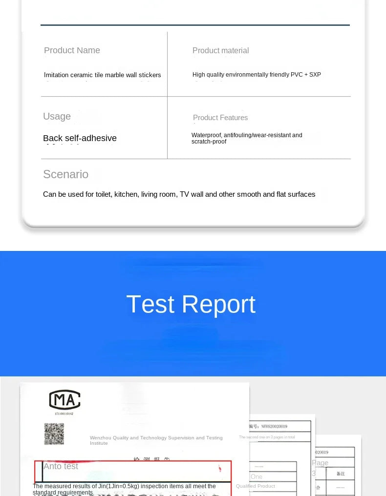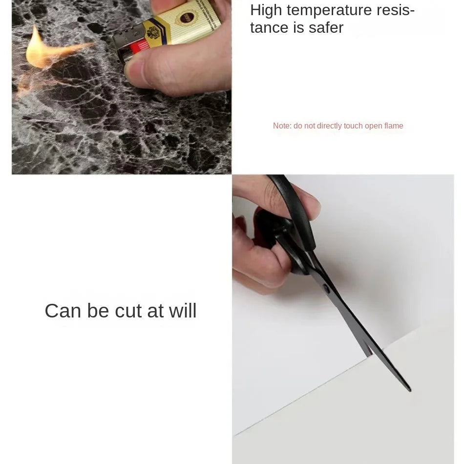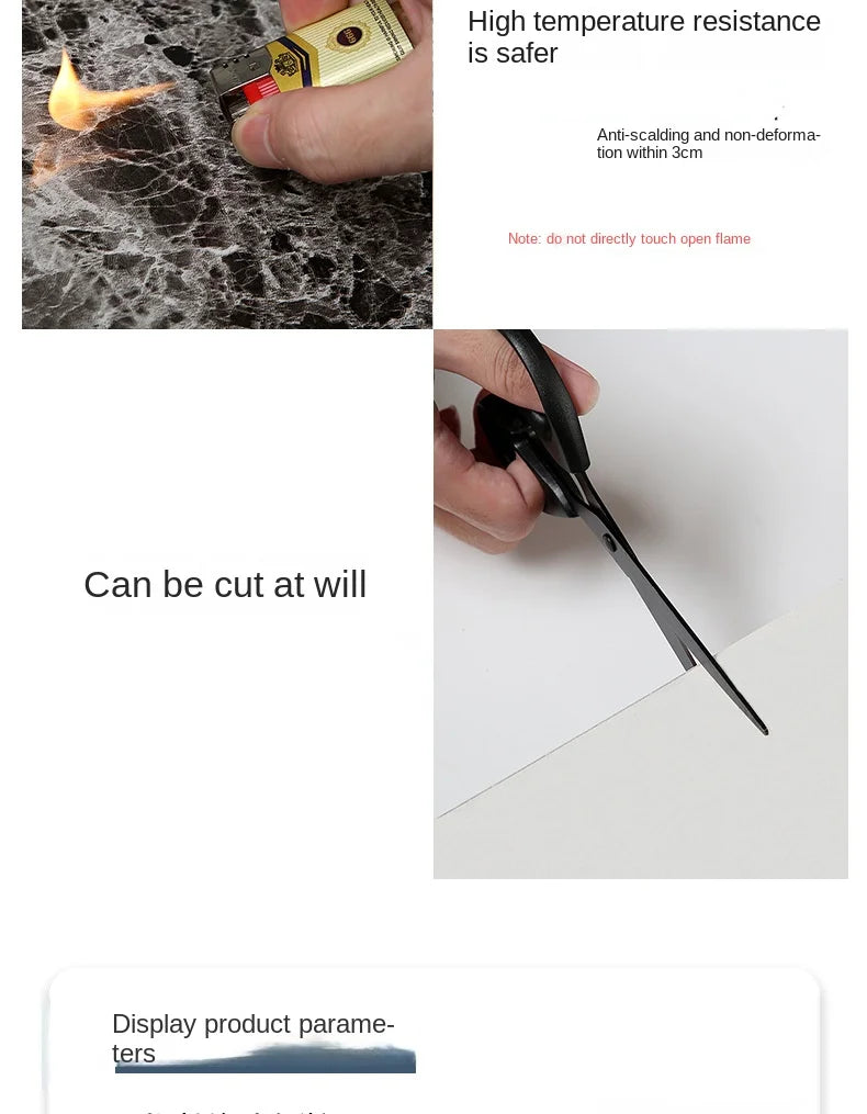 Imitation ceramic tiles, imitation marble sheet shaped self-adhesive wallpaper, kitchen furniture renovation stickers, waterproof, oil resistant, fire resistant, high temperature resistant, dirt resistant, moisture-proof, stain resistant, with self engraved lines on the back for easy cutting, thickening, scratch and wear resistance, durability, easy cleaning, and easy maintenance.
