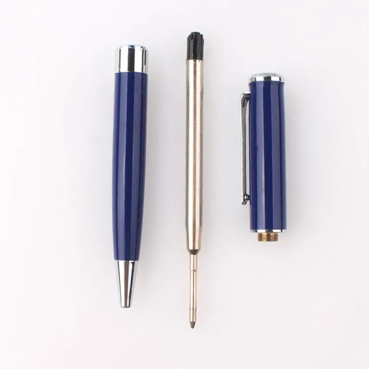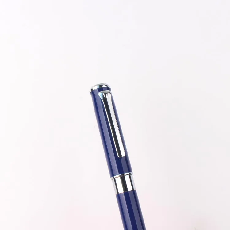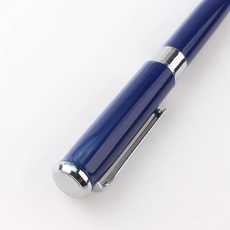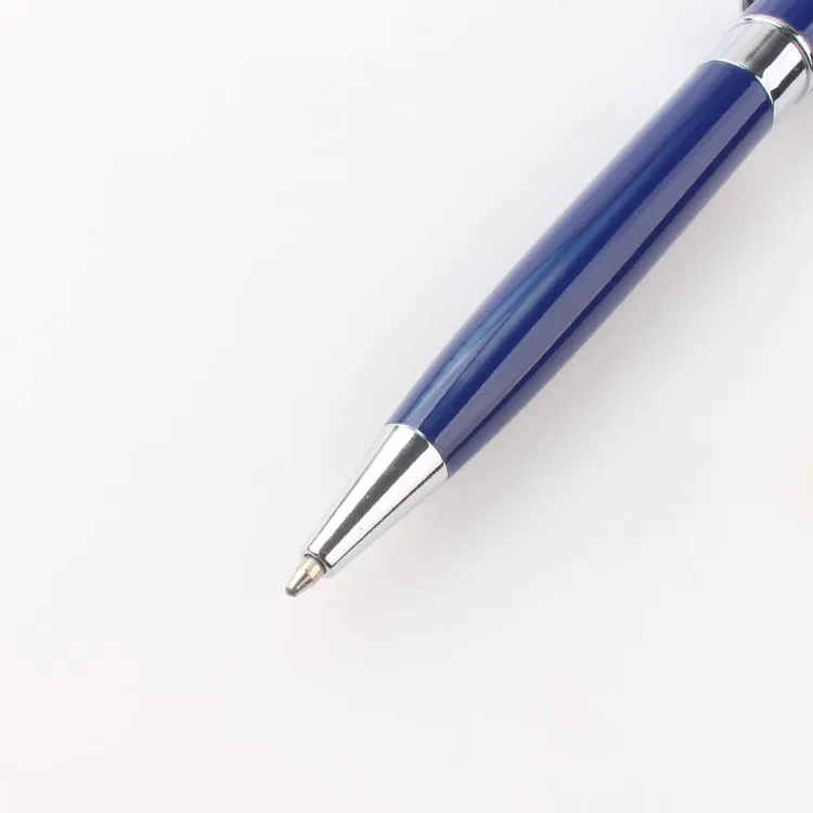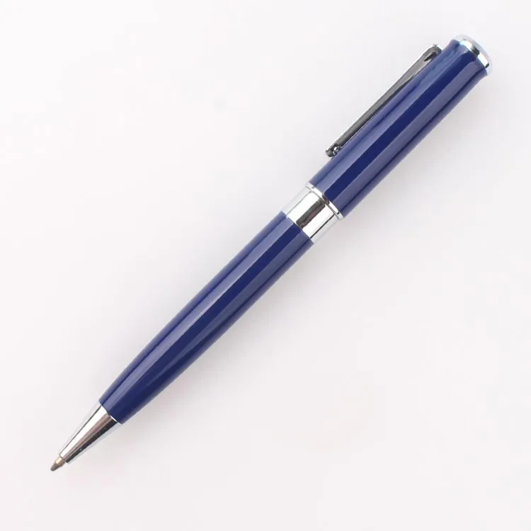 High-quality blue metal ballpoint pen, unique design, silver chrome-plated rim, custom logo printing available.