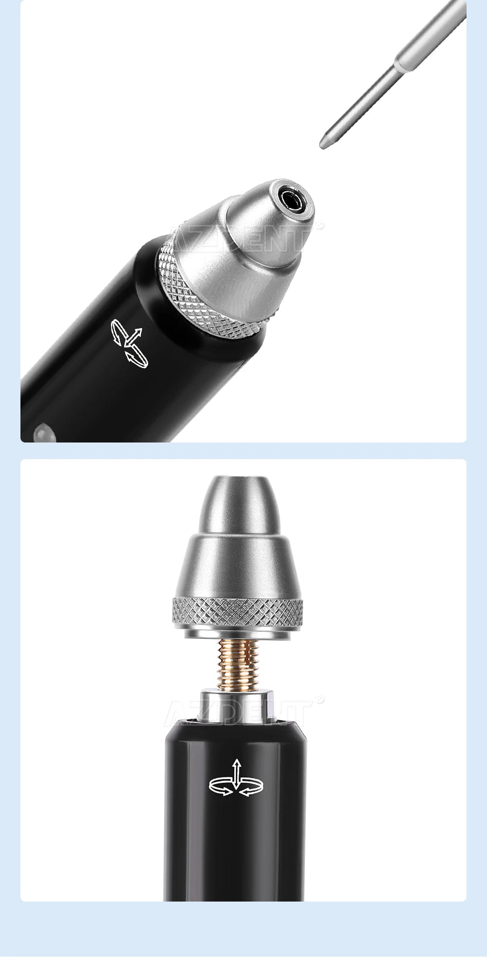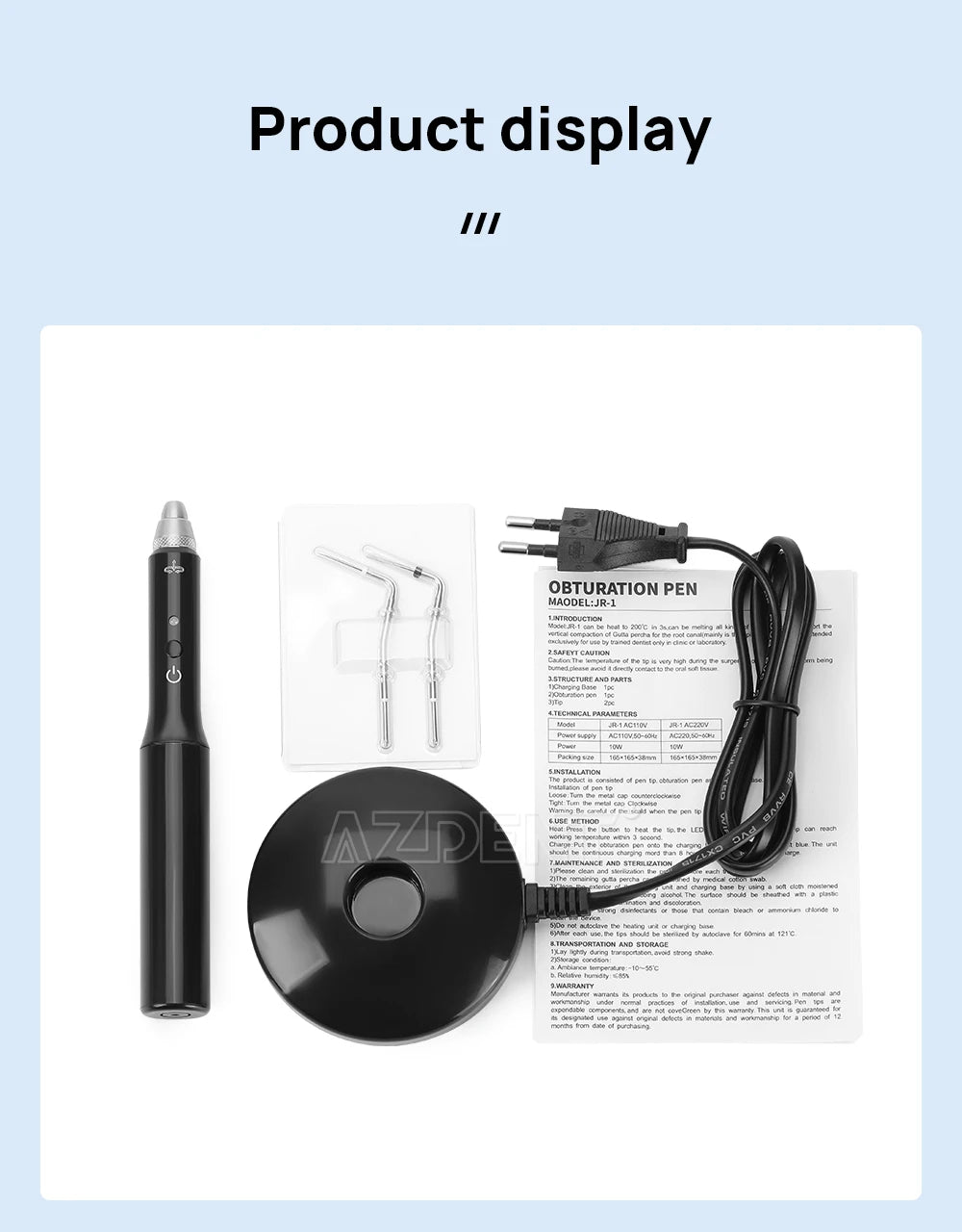 Charge:Put the obturation pen onto the charging base, the LED indicator light blue.The unit should be continuous charging more than 8 hours from low voltage to full charge.