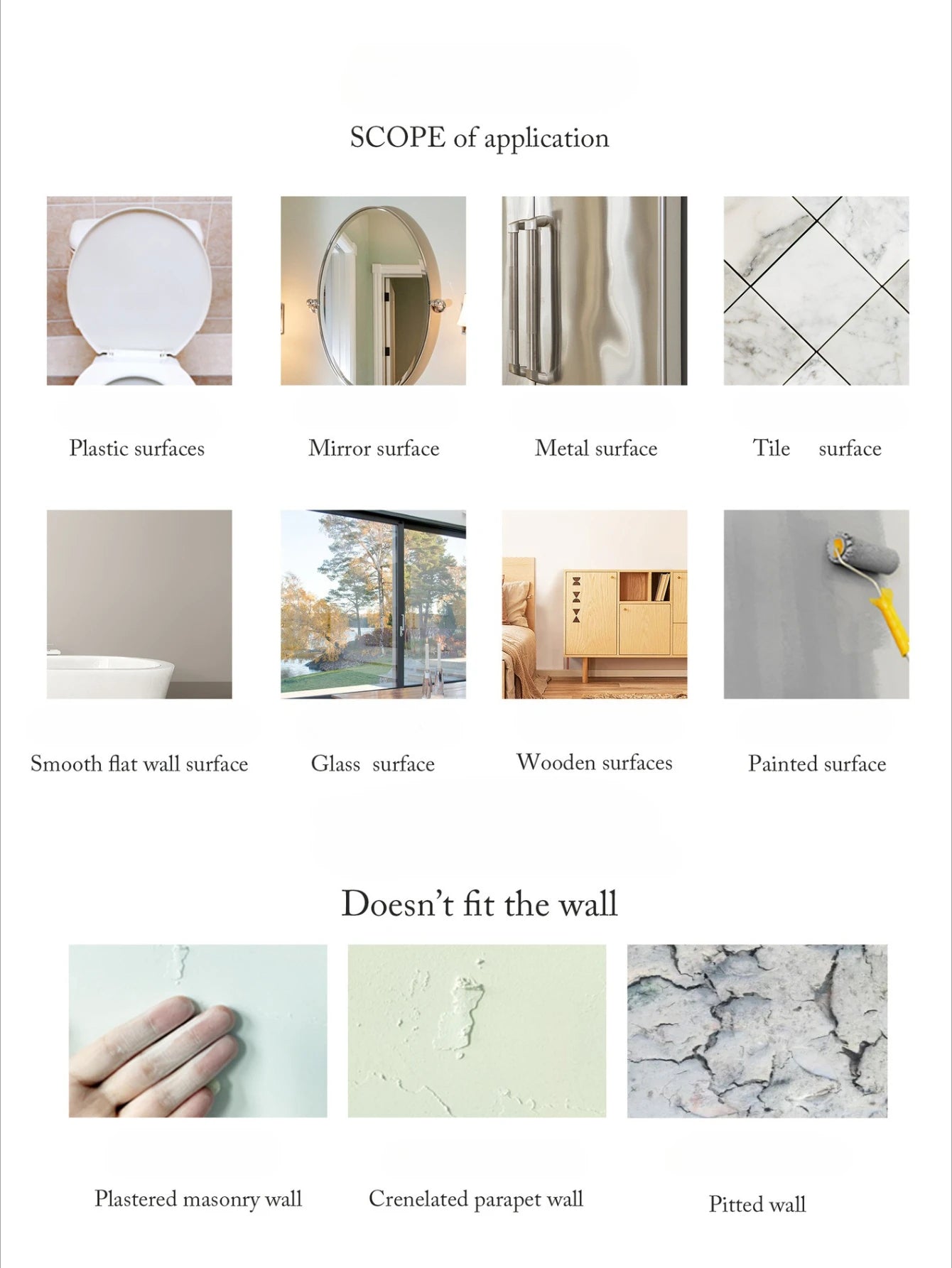 Can be applied to any smooth and clean surfaces such as walls, doors, windows, closet, etc.