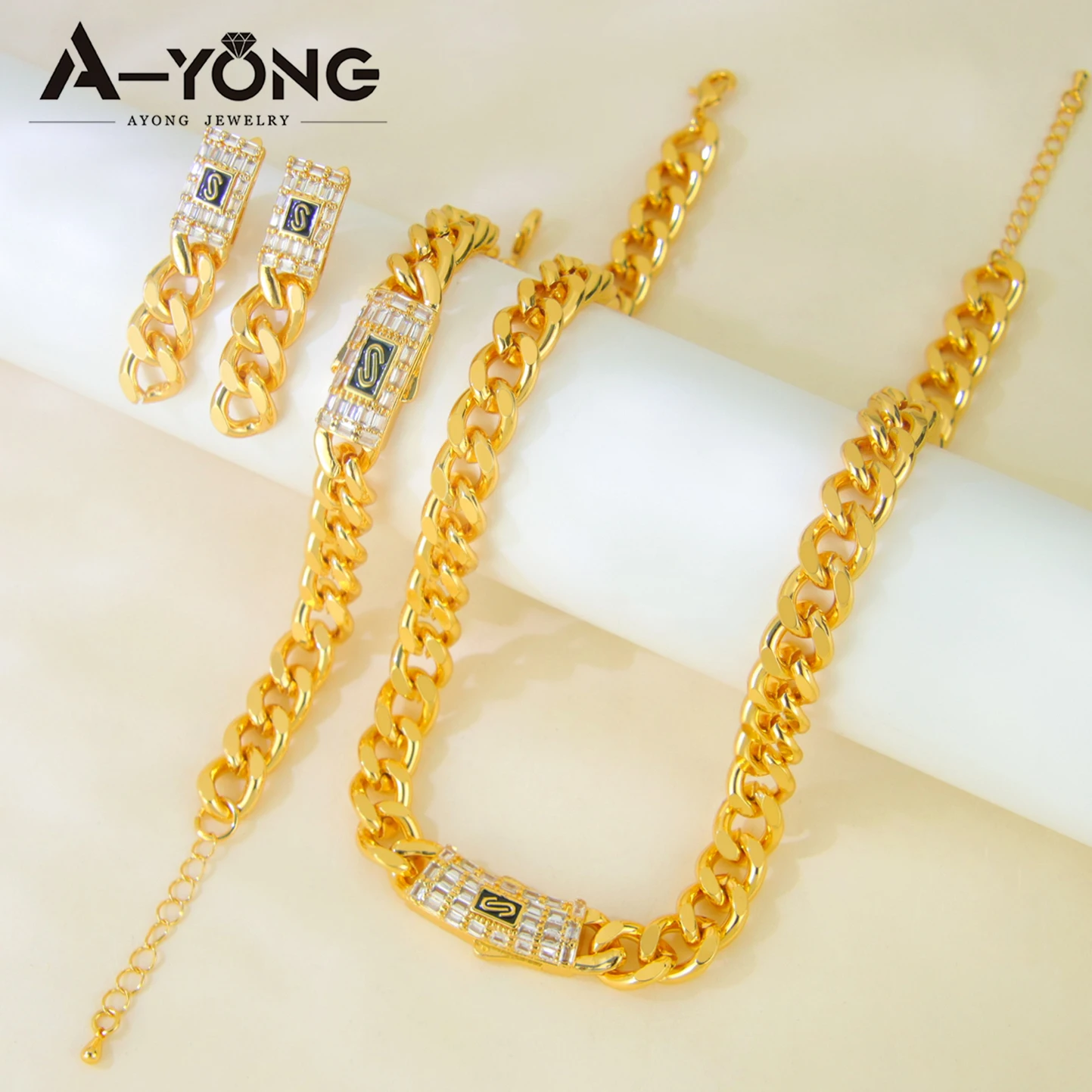 Dubai Fashion Gold Jewelry Set 21k Gold Plated Brazilian Zirconia Necklace Bracelet Earrings Italian Women Daily Party Jewelrys