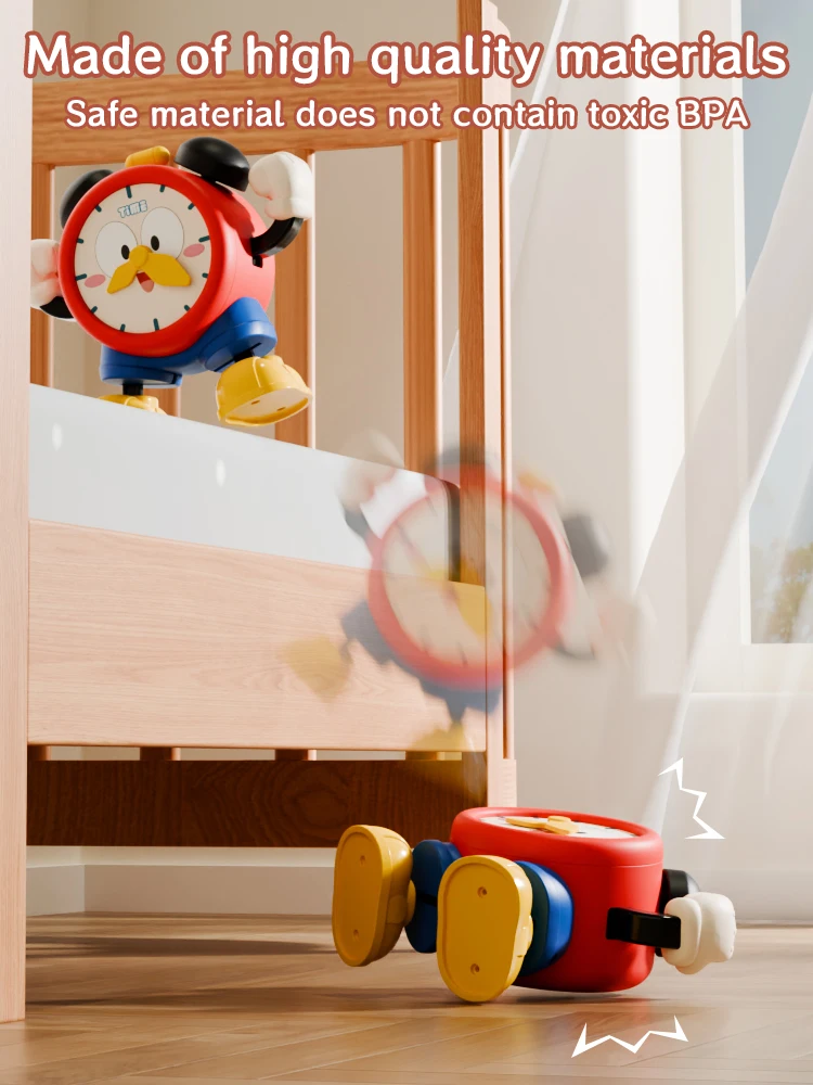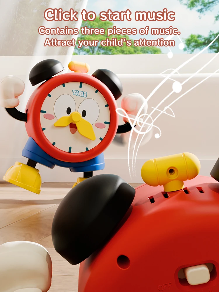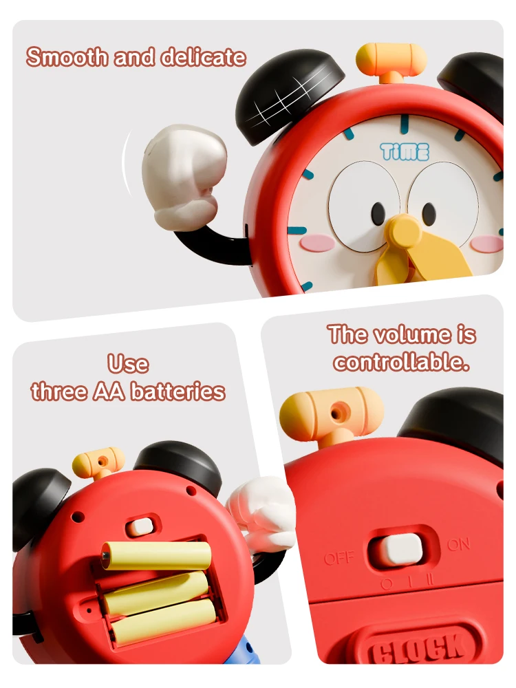 1. Turn on the switch, and the clock toy will move and dance to the rhythm of the music. (Toys need to be equipped with three No. 5 batteries)