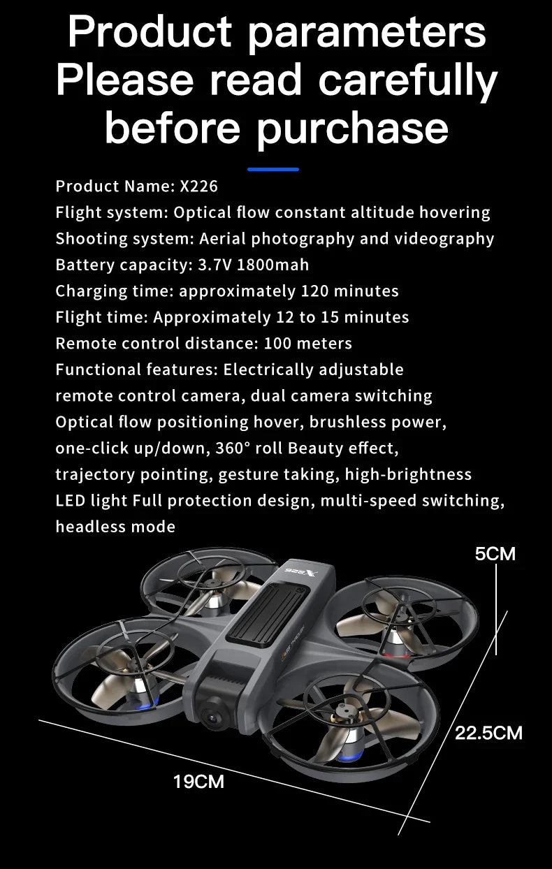 V226-brushless motor, with 4.5-inch remote controller with screen, electric adjustment camera, optical flow height setting function, dual camera switching, speed switching, headless mode, six channels with gyroscope, roll