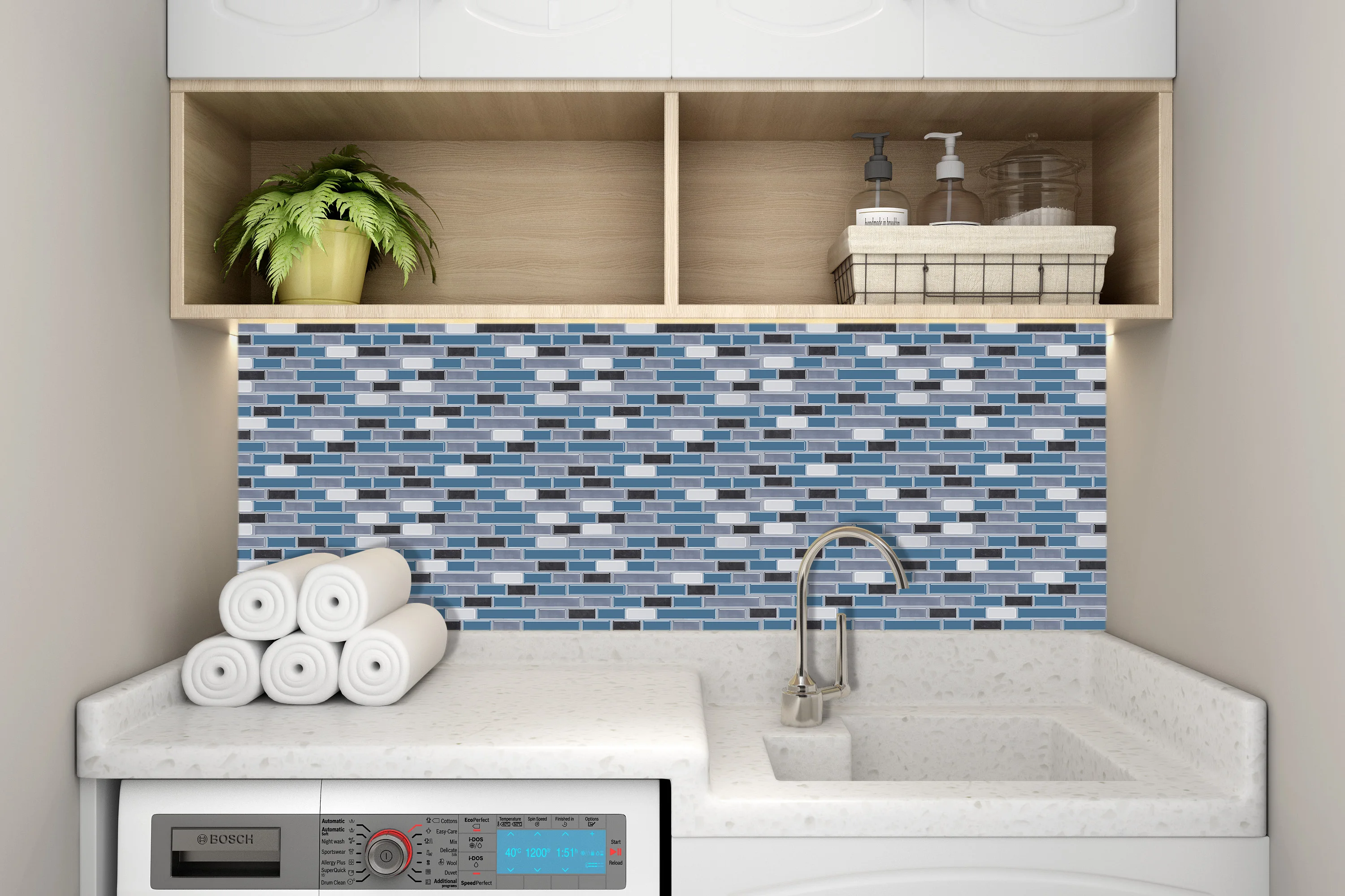 Tiles can be easily installed directly onto existing wall panels or smooth surfaces. Specially designed for kitchen and bathroom walls, the tiles are resistant to heat from stoves and humidity in bathrooms.