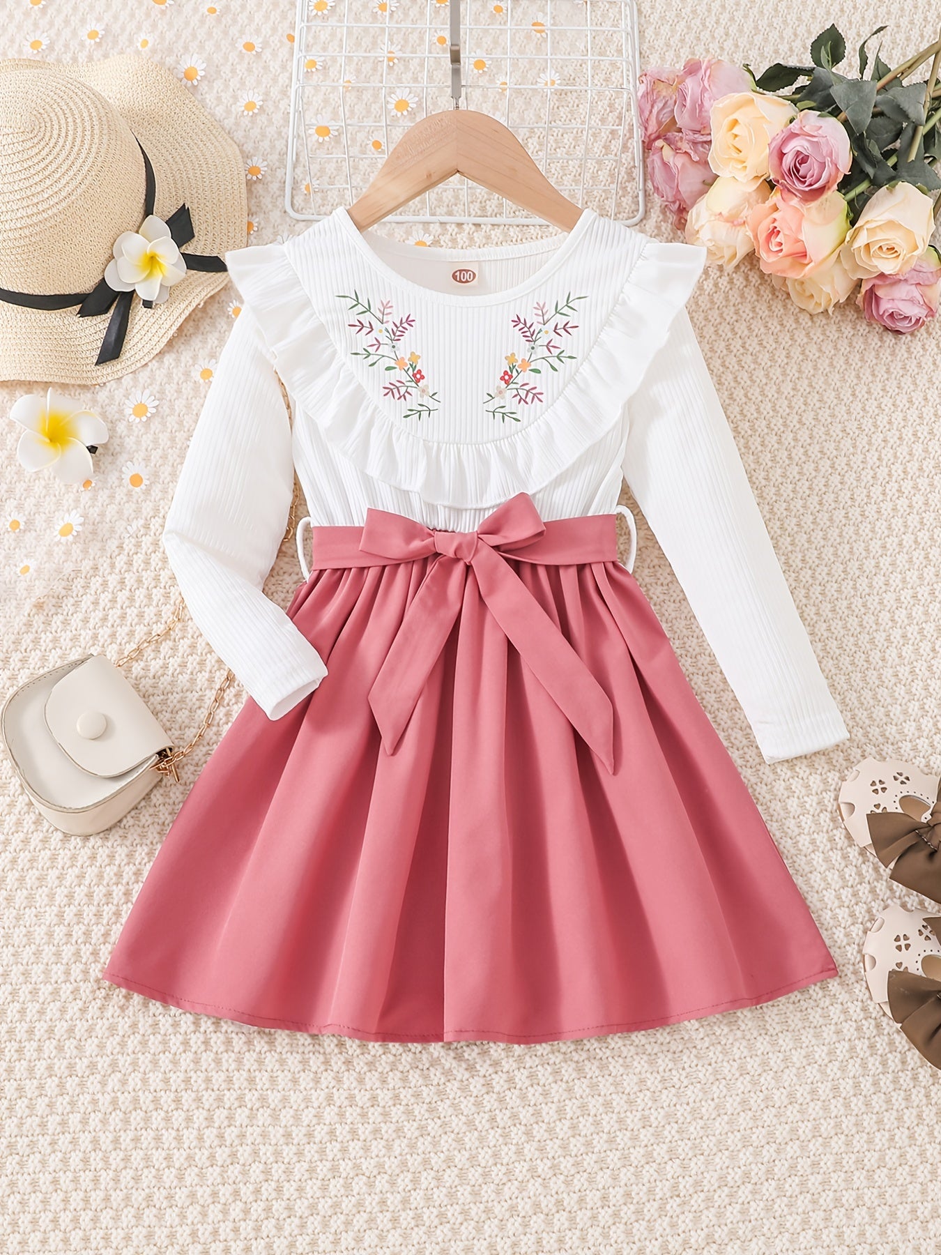 Baby Girl's Long Sleeve Floral Dress with Belt - Gentle Spring and Autumn