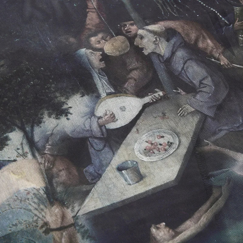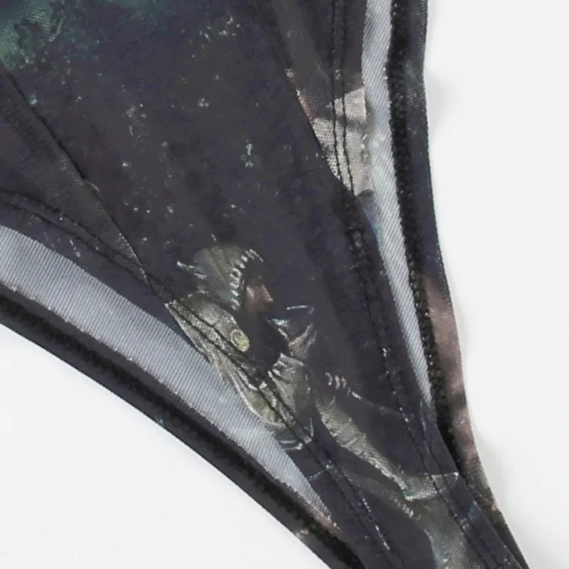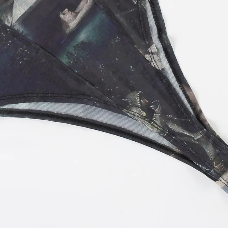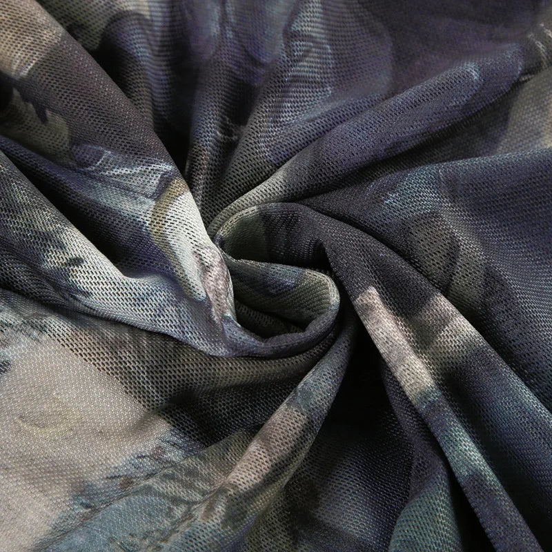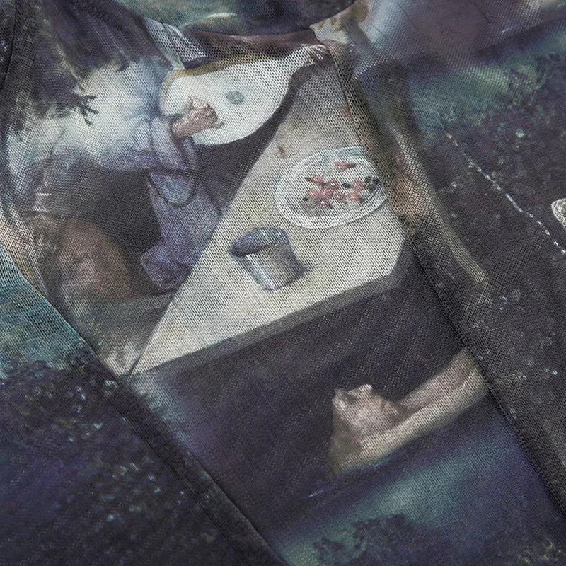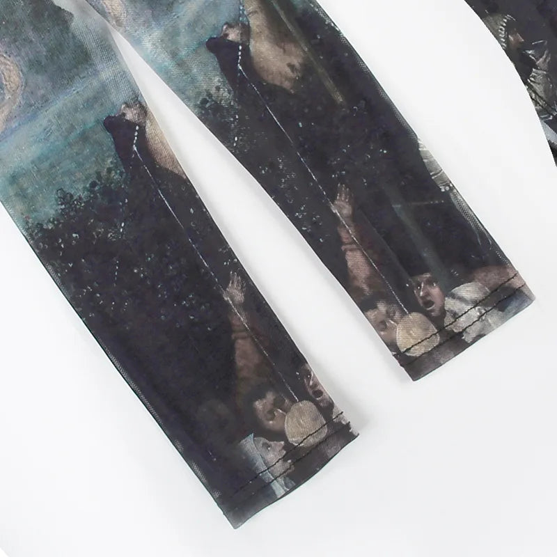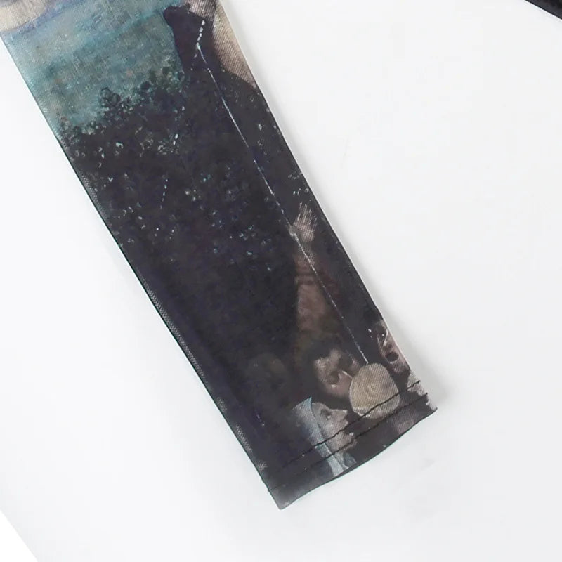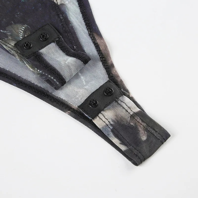 Goth Dark 90s Retro Print Mesh Long Sleeve Skinny Bodysuits Cyber Y2K Sheer Tops Women Gothic Lace Patchwork Bodysuit Streetwear