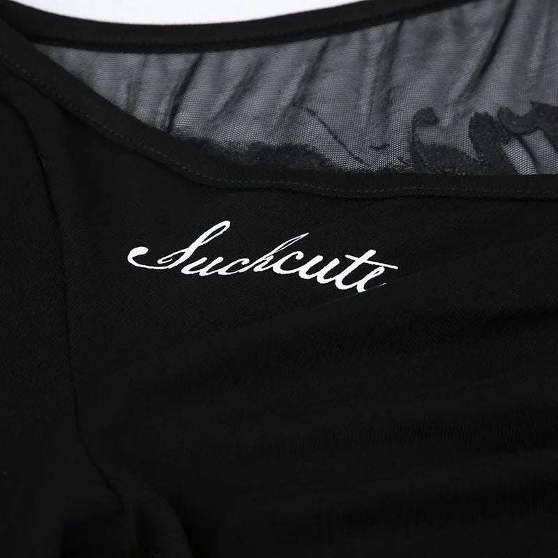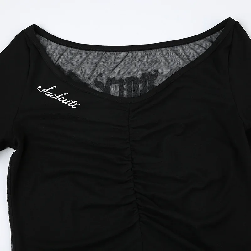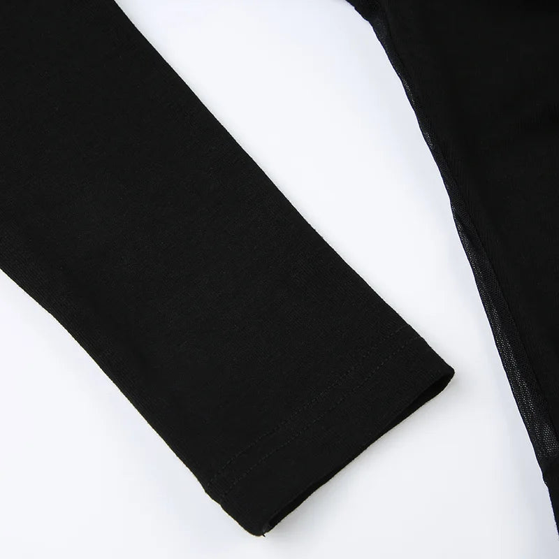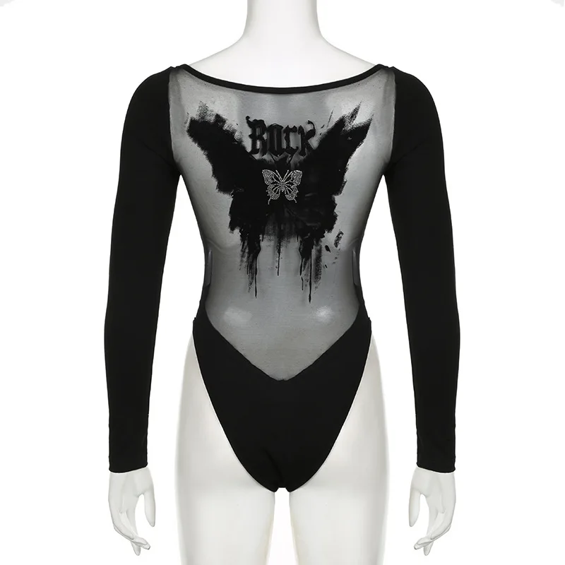 Goth Dark Mall Gothic Mesh See Through Butterfly Print Skinny Bodysuits Sexy Backless V-neck Overalls Y2K Grunge Street Bodysuit
