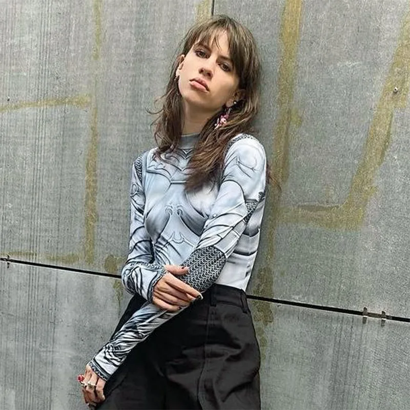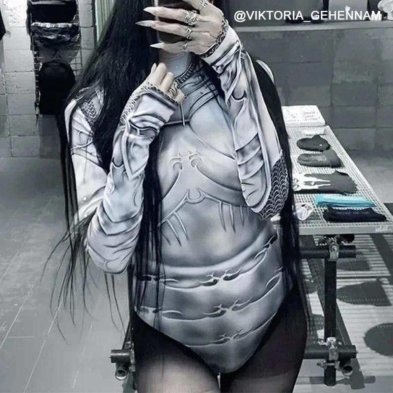 Goth Dark Techwear Printed Y2k Fashion Bodysuits Cyber Gothic Punk Long Sleeve T-shirts Bodycon Women Grunge Streetwear Bodysuit