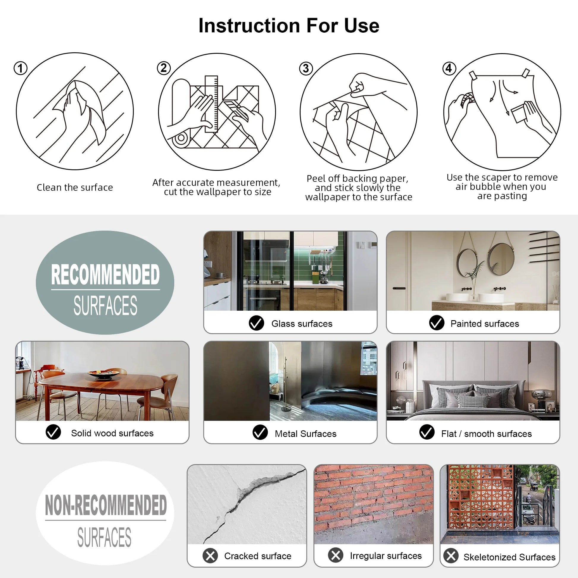 living spaces, kitchens, bathrooms, walls, desks, and more. Best suited for flat, smooth, clean, and dry surfaces like white
