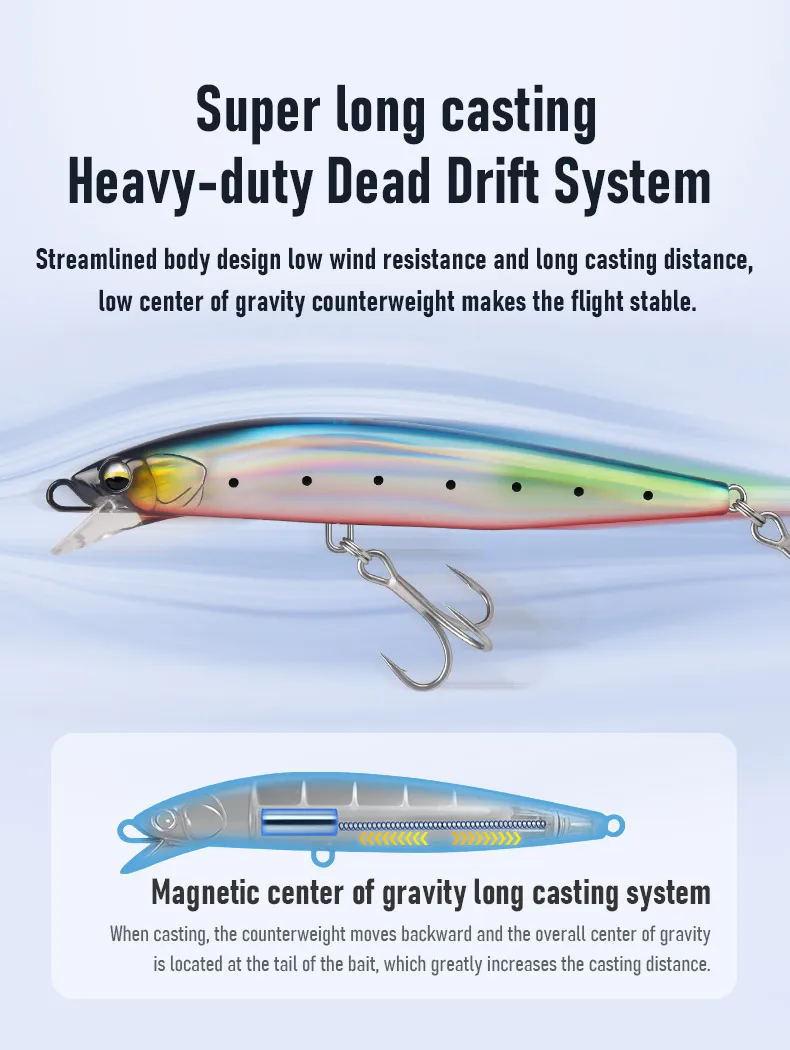 -When casting, counterweight moves backward, center of gravity moves to tail of the bait as well, increases casting distance.