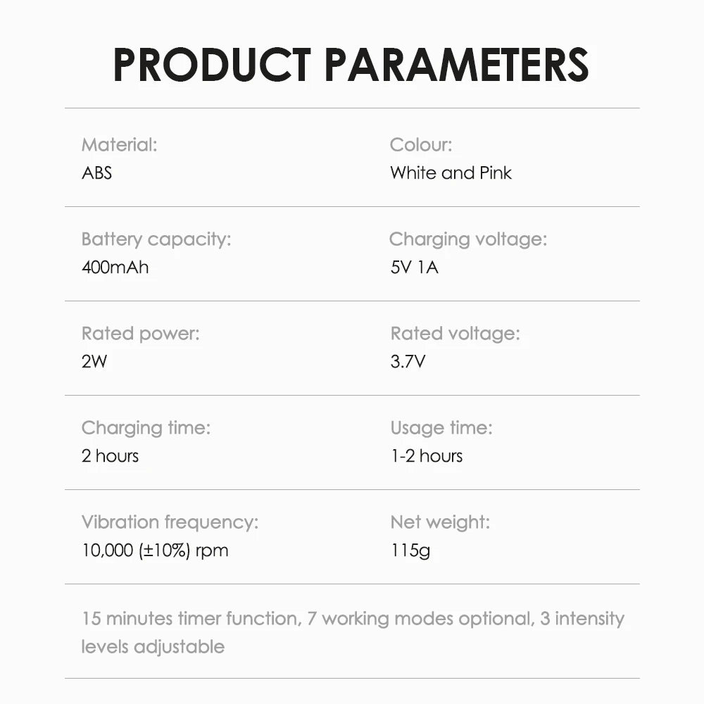 2. The facial massager has seven optional modes to meet different skincare needs. Mode 1: orange light, hot compress and induced vibration; Mode 2: red light, hot compress and induced vibration; Mode 3: blue light and induced vibration; Mode 4: yellow light, hot compress and induced vibration; Mode 5: purple light, hot compress and induced vibration; Mode 6: green light and EMS microcurrent; Mode 7: cyan light, hot compress and induced vibration.