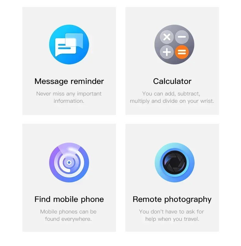 ●Bluetooth call ●Custom watch faces●Off screen time setting●Band language switch●Pedometer●Qevila Dial switch●Calories Breath training