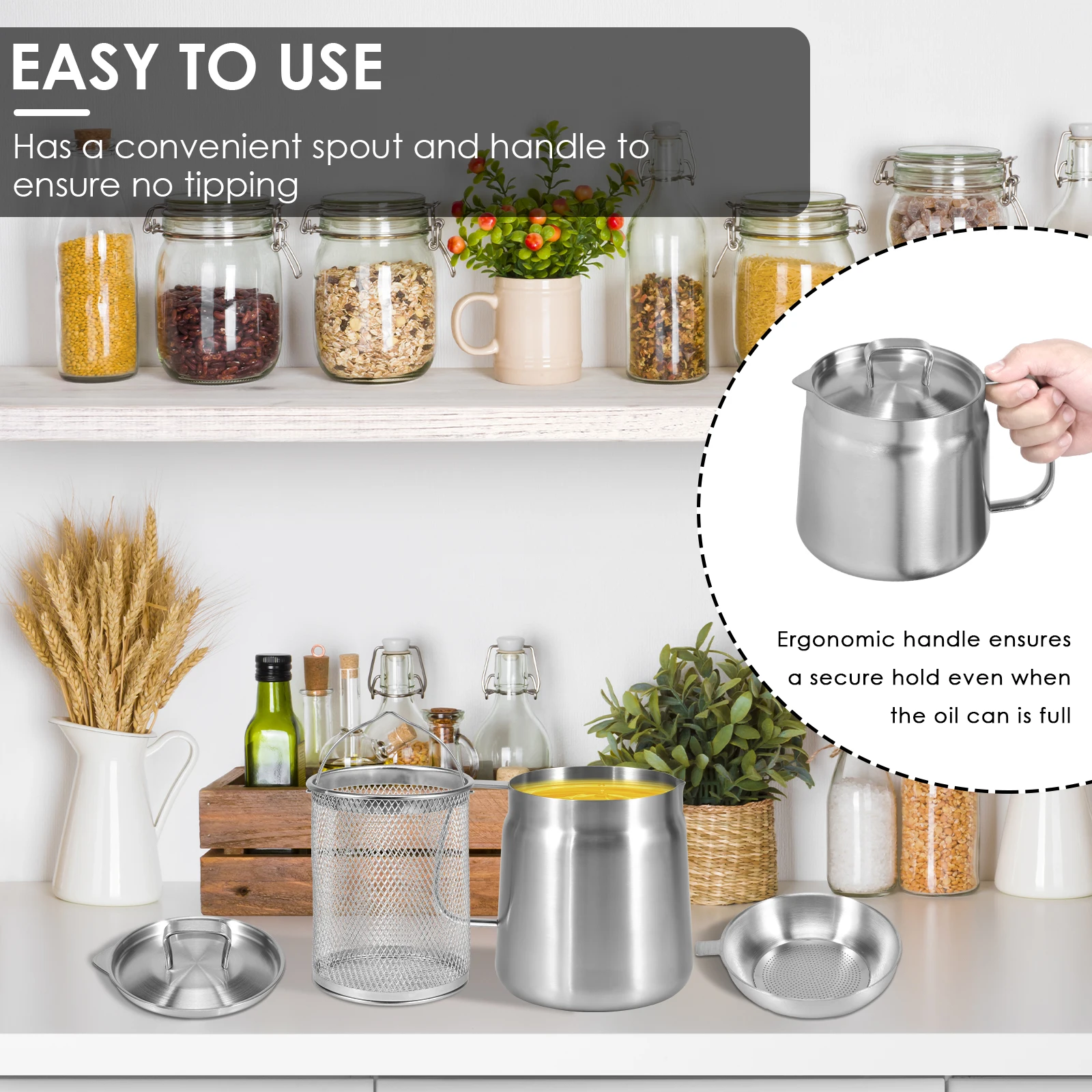 [Efficient Oil Filter] This 304 stainless steel oil filter pot is equipped with a fine mesh filter that skillfully sifts out dirt and debris. The thoughtful handle design makes lifting and pulling a breeze. The unique eagle mouth spout ensures that the oil pours out easily and that there is no oil hanging from the deflector