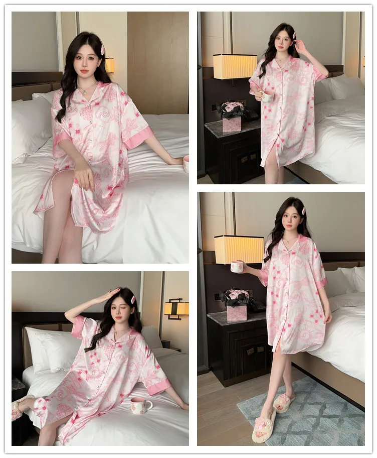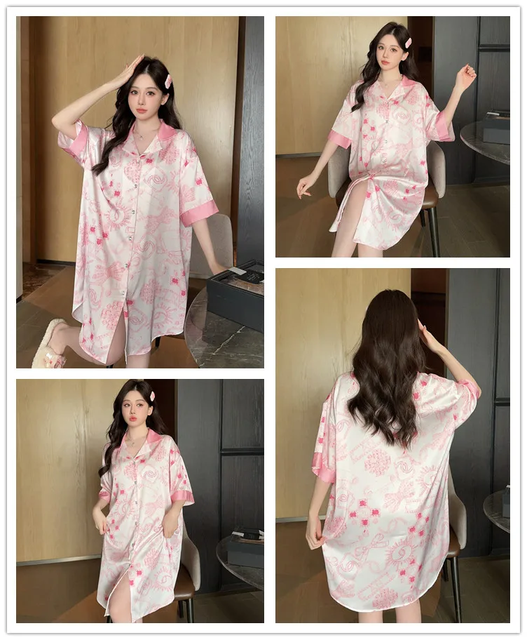 Plus size shirt dress 2024 new women's satin pajamas summer loose lapel ice silk thin cardigan home wear nightdress