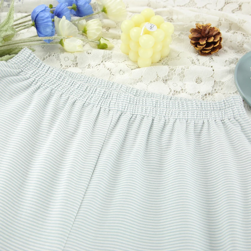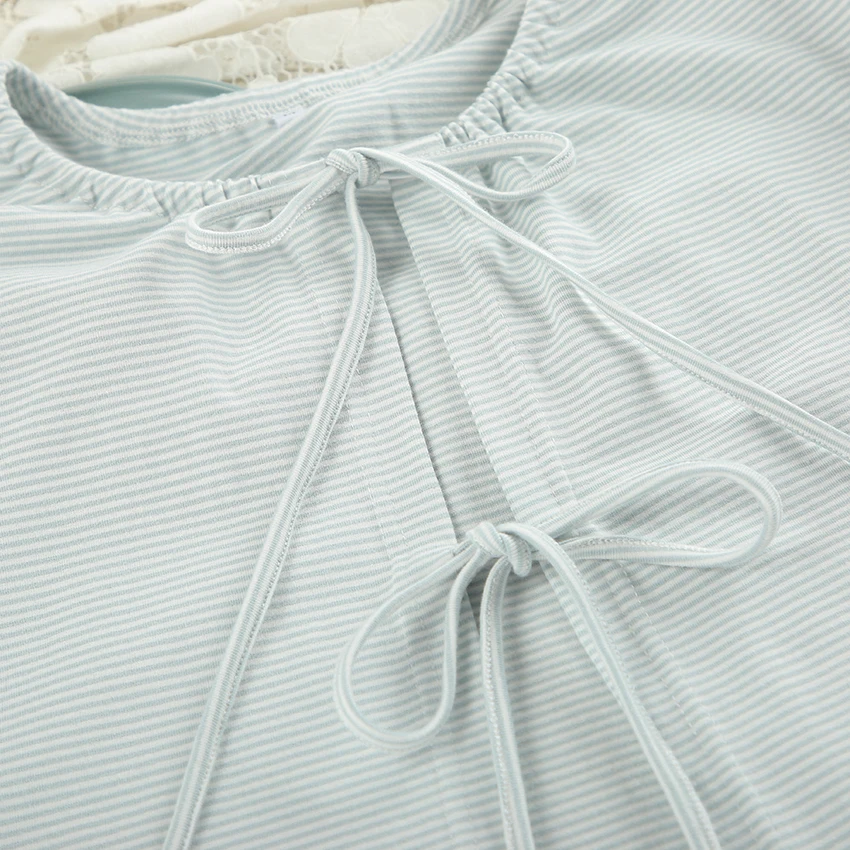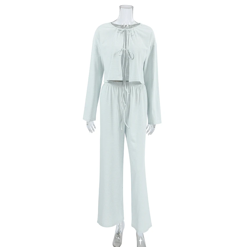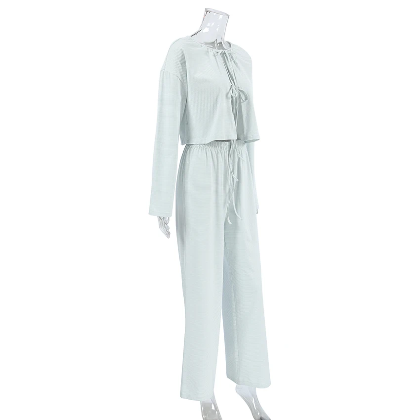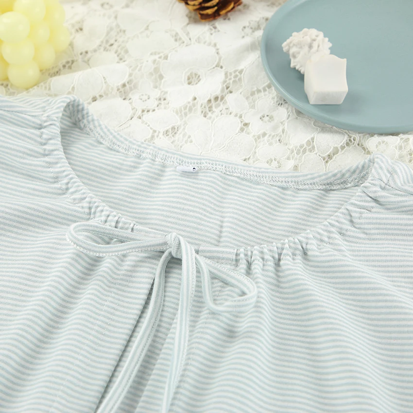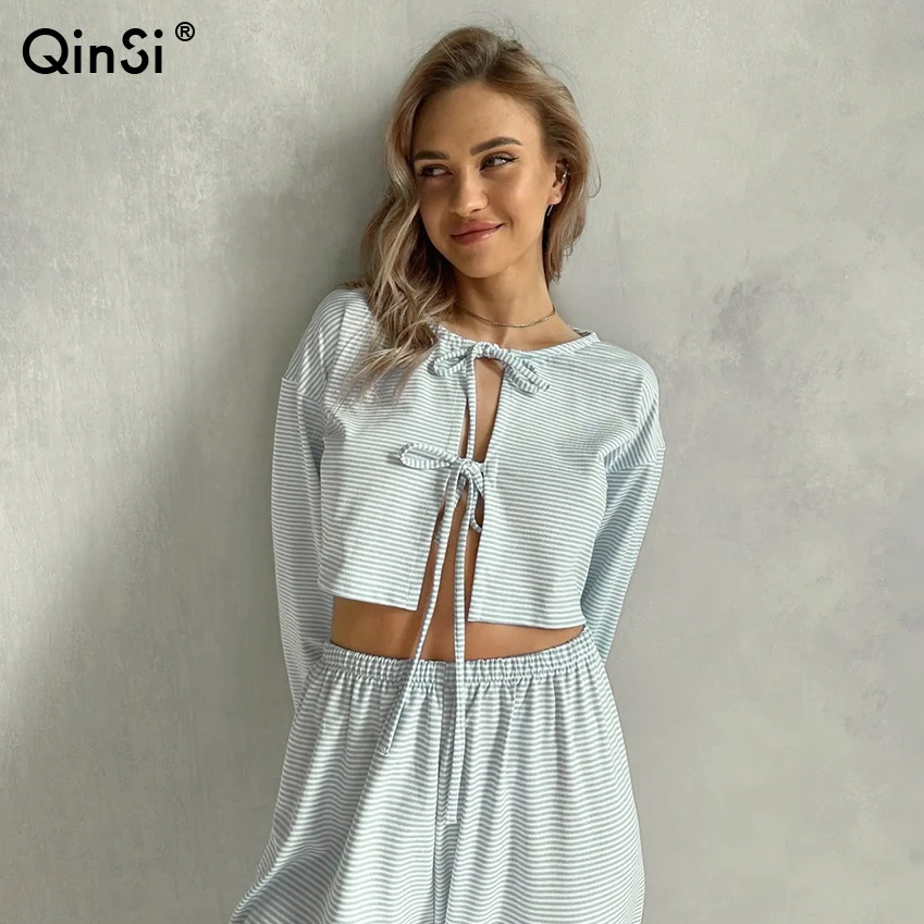 QINSI Autumn Stripe Cotton Pajamas for Women Lace up Full Sleeves Short Top Wide Leg Pants Pajama Sets Blue Soft Pijamas Woman