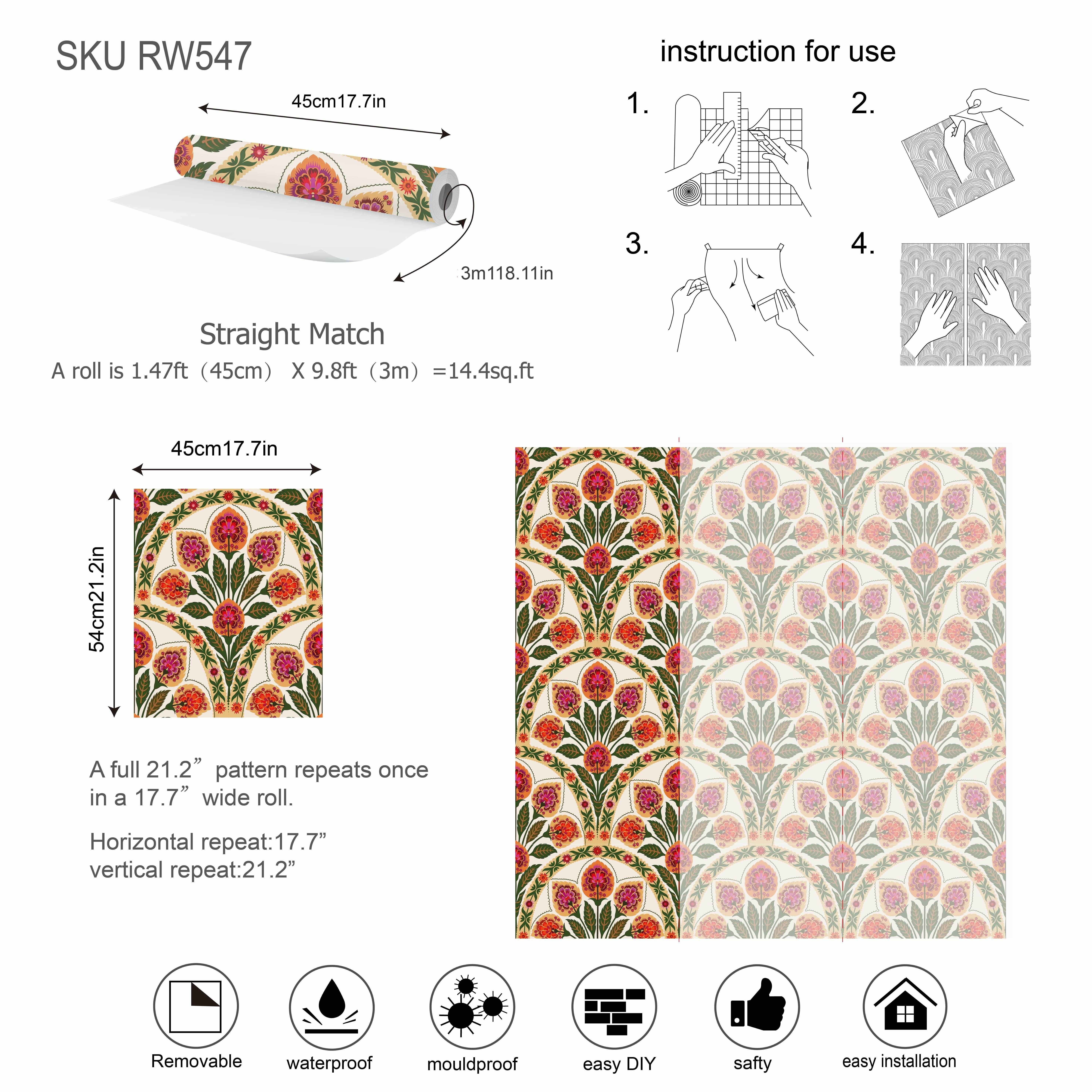 Waterproof Vintage Floral Wallpaper 17.7x9.8ft