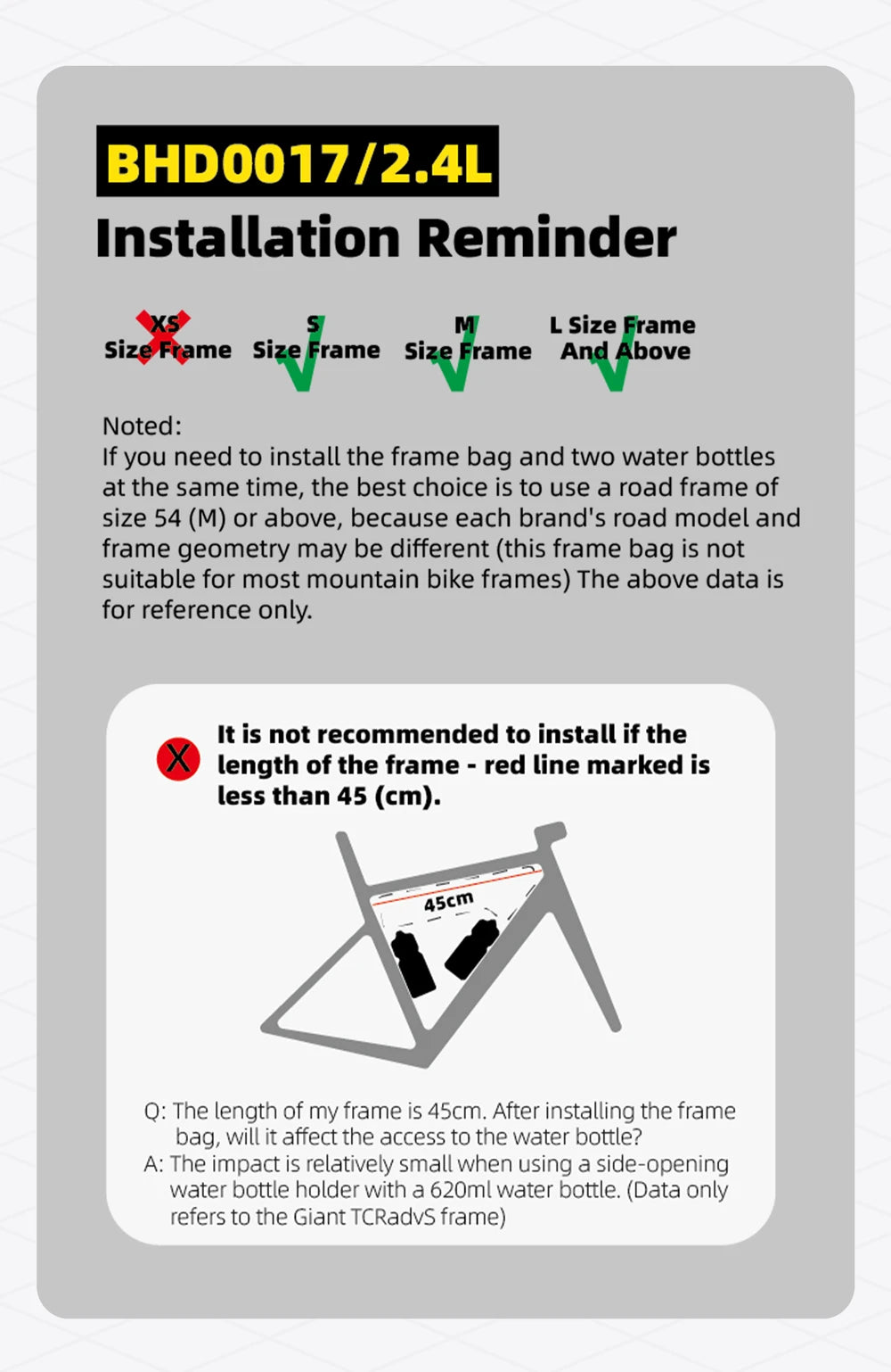 -WATER BOTTLE HIDING DESIGN: Installing it on a frame larger than 54 yards will hardly affect the access to the water bottle (620ML).