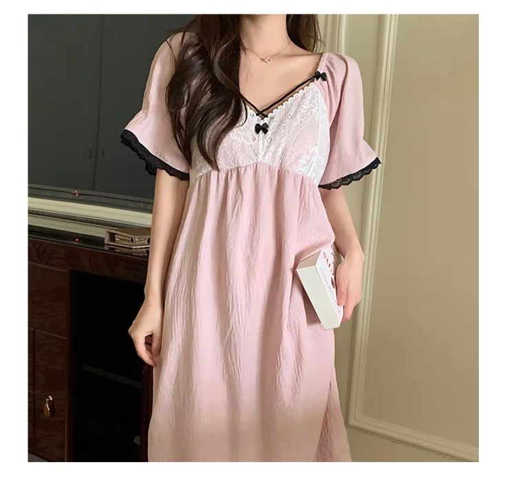 SAMWESTART cool cotton silk nightgown with lace bow and short sleeves