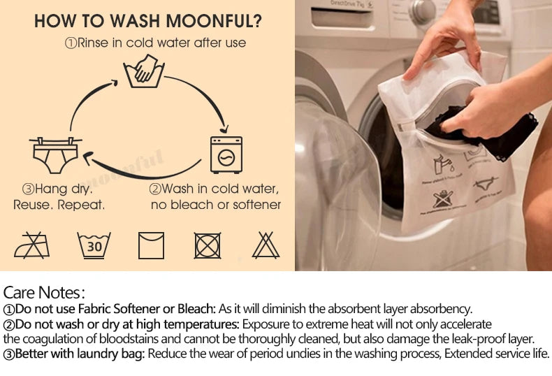 Step 1. Wash your MOONFUL before wearing them for the first time. This will activate the technology in the gusset for maximum absorbency.