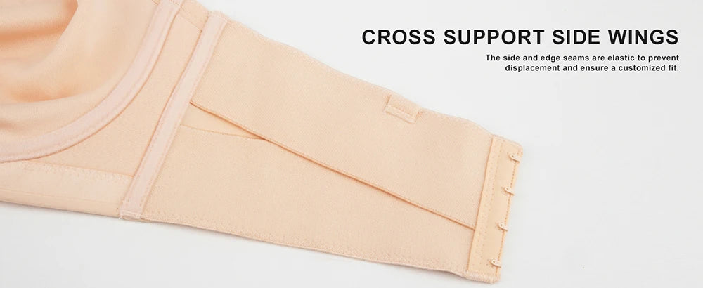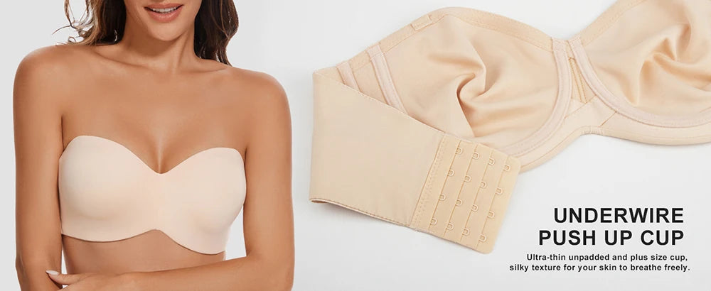 Silicone-Free Anti Slip and special type of band is stuck on top of the cups to prevent slipping and no worry about skin discomfort. Underwire cup makes sure this strapless in place