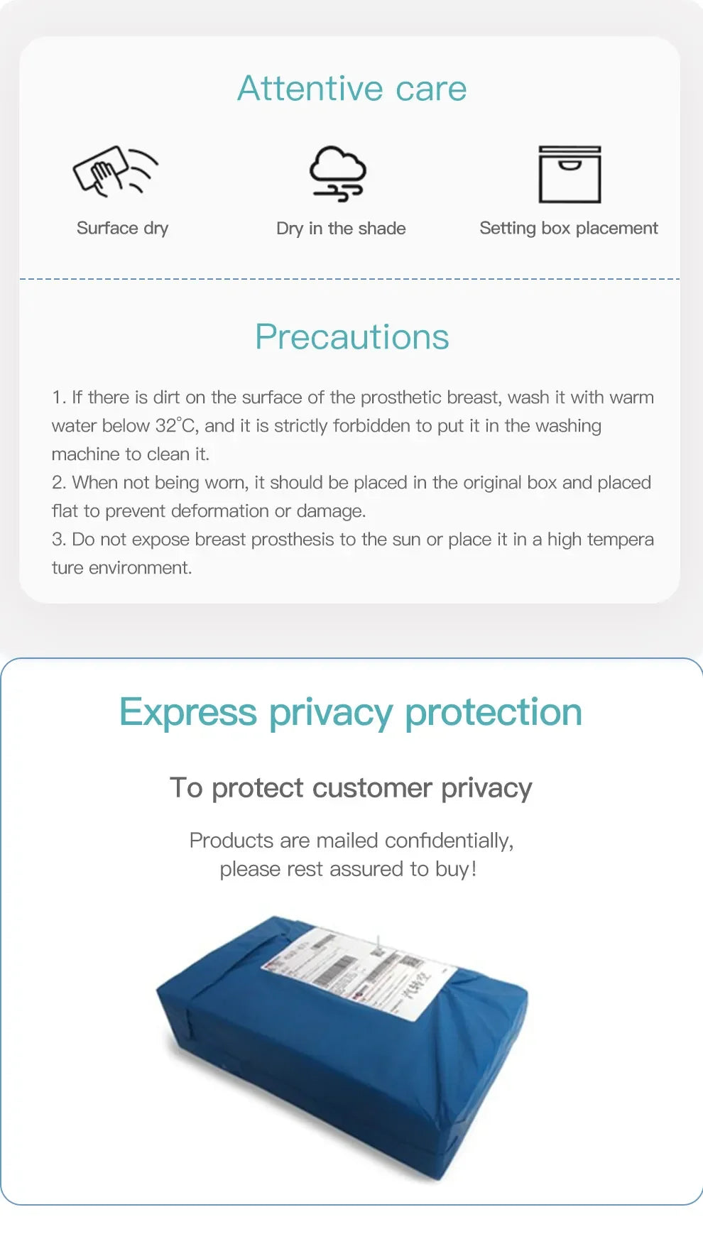 2. Do not squeeze or rub the prosthetic breast. It is strictly forbidden to break the prosthetic breast.