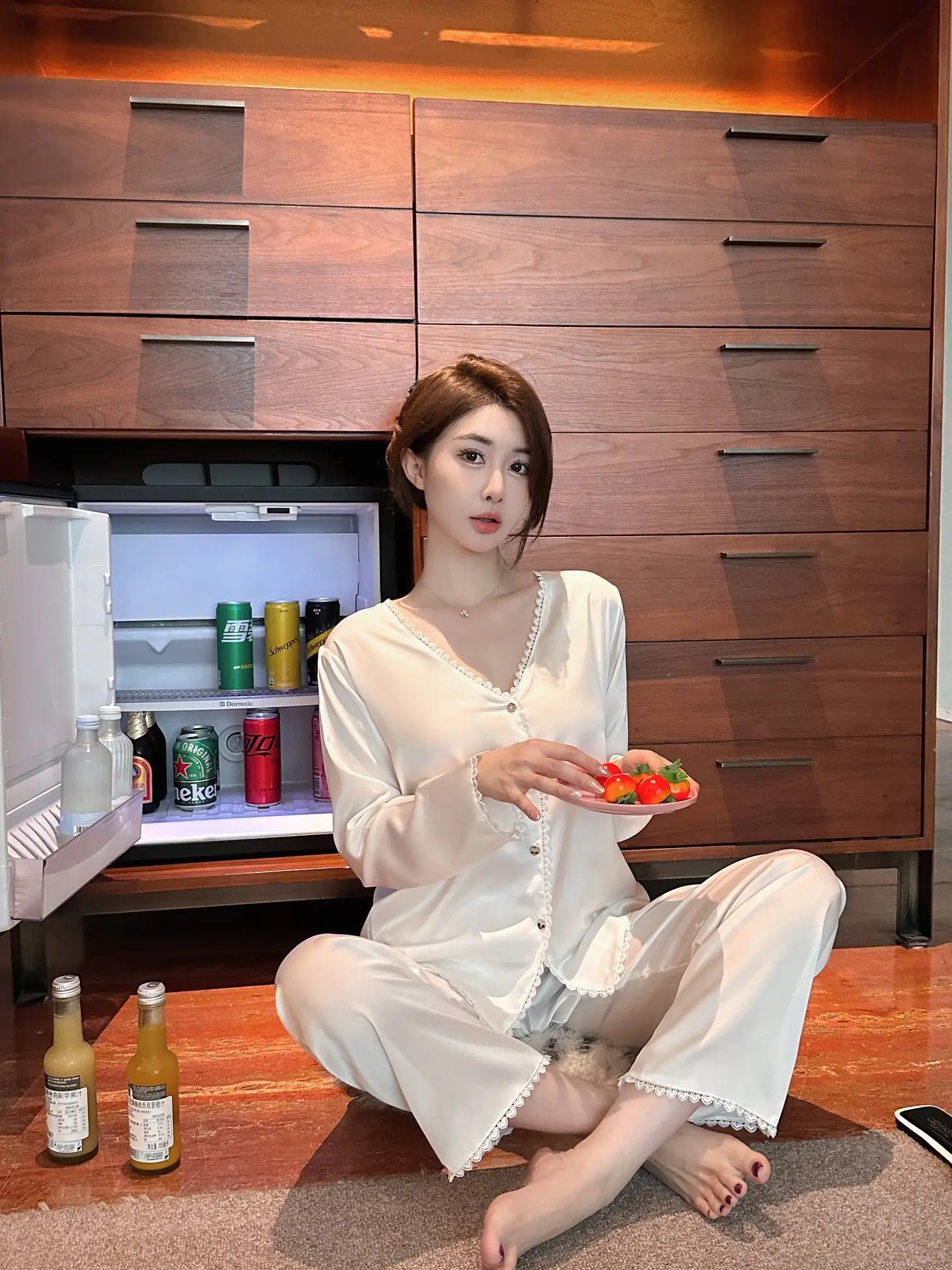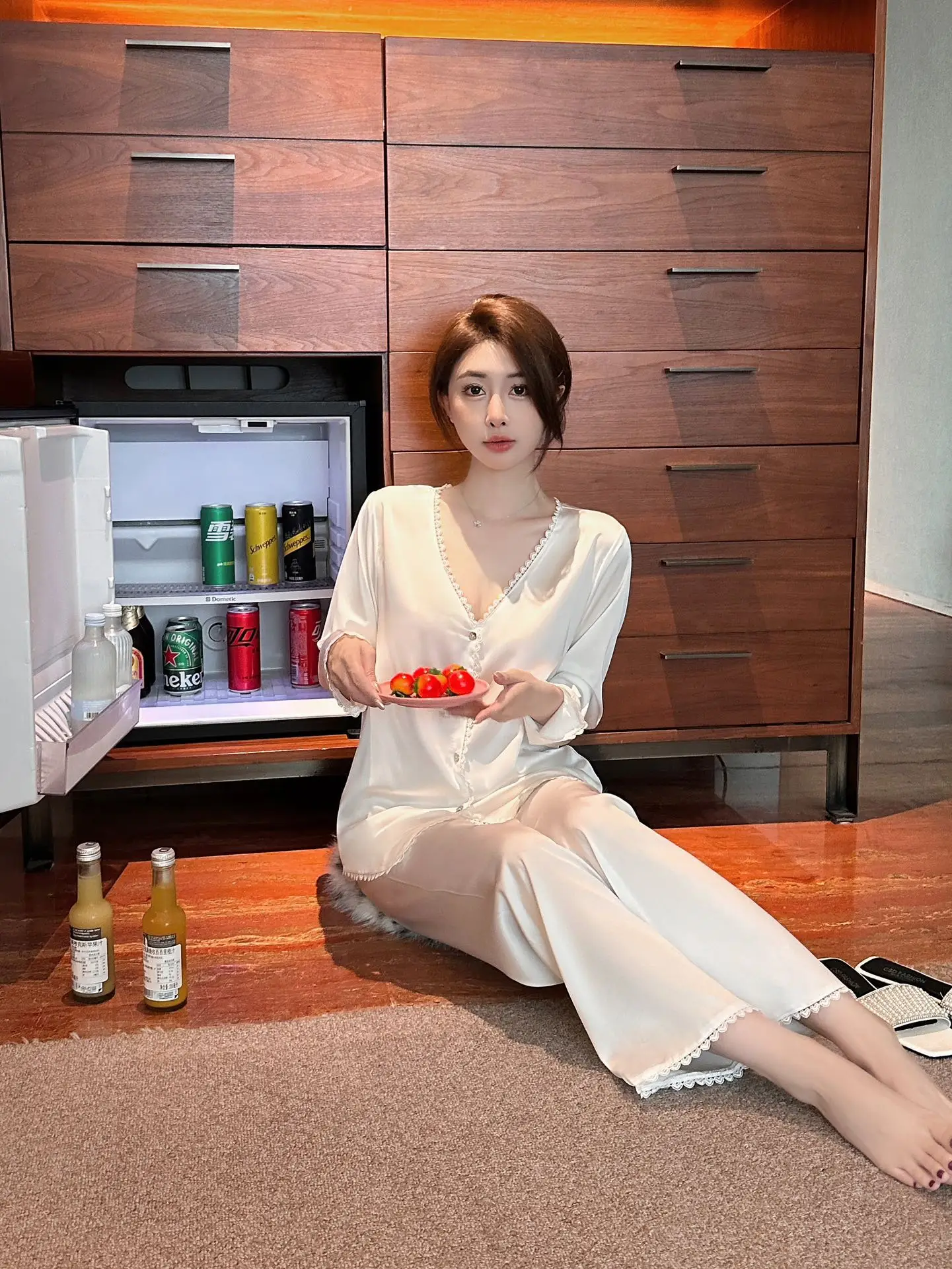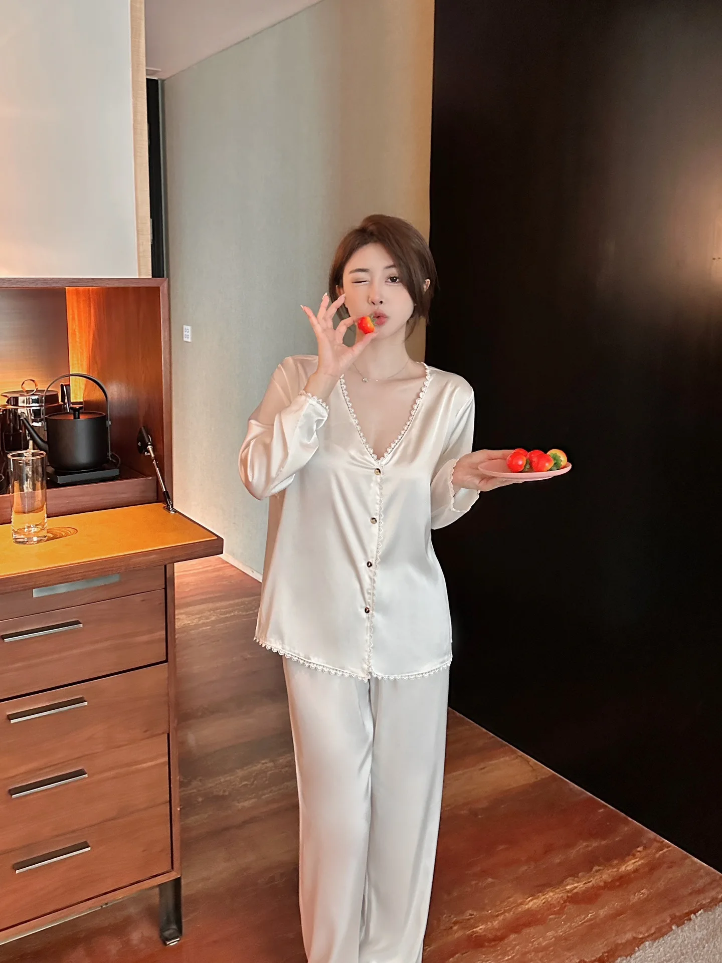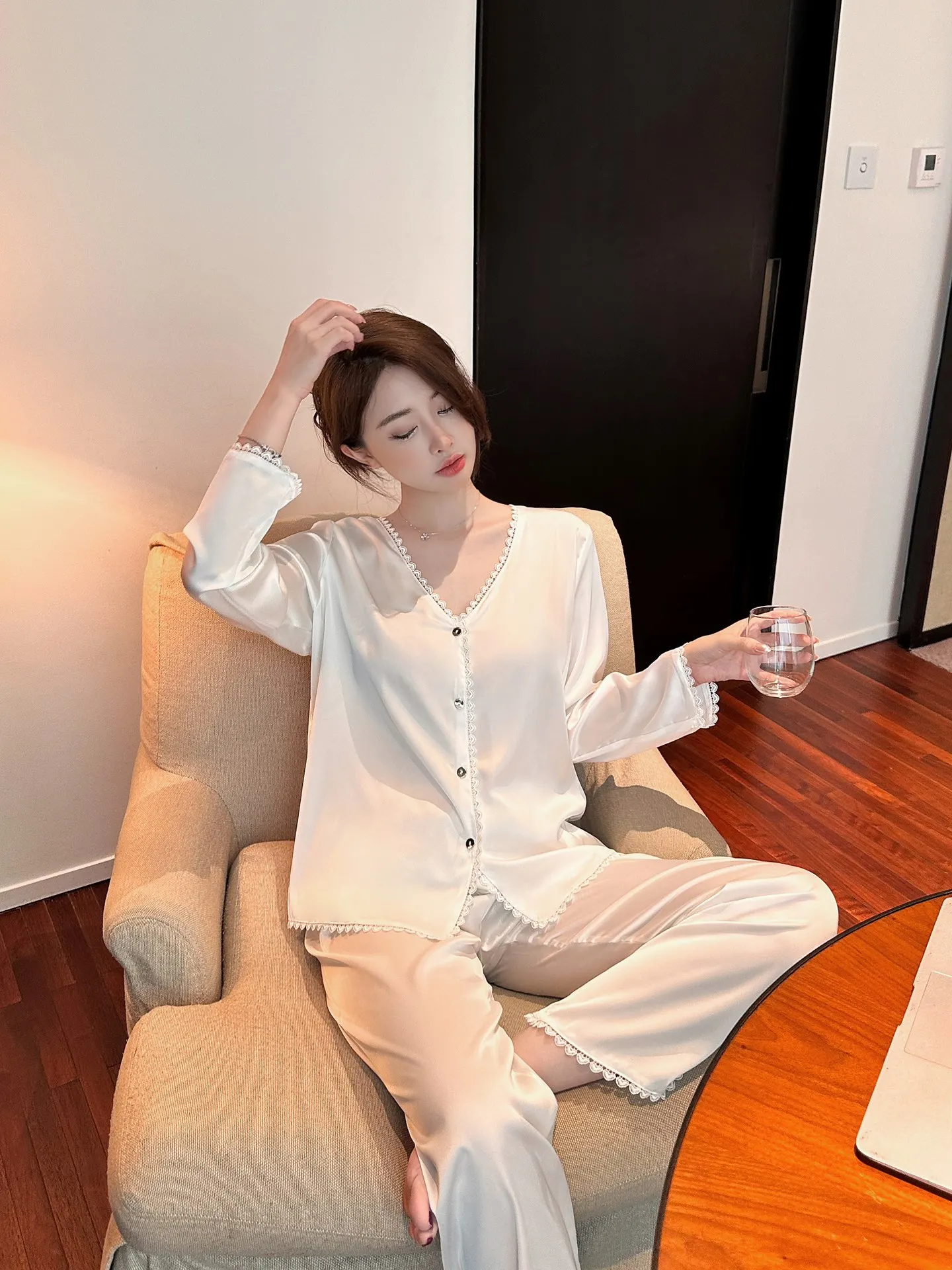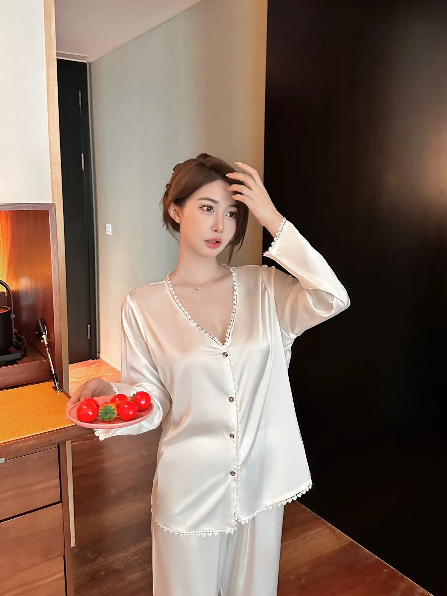 Solid Color Lace V-neck women's satin pajamas Sexy elegant girl long sleeve sleepwear ice silk comfortable home wear set |