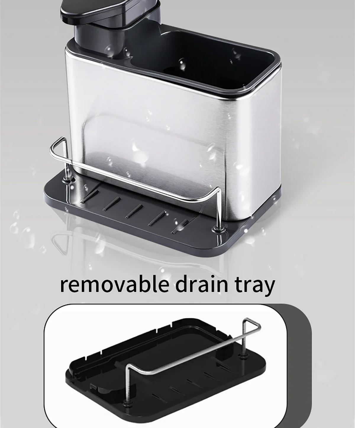 Application: Suitable for use around the kitchen sink, used to store cleaning sponges, brushes and other cleaning supplies, while dispensing detergent, convenient for daily kitchen cleaning work.
