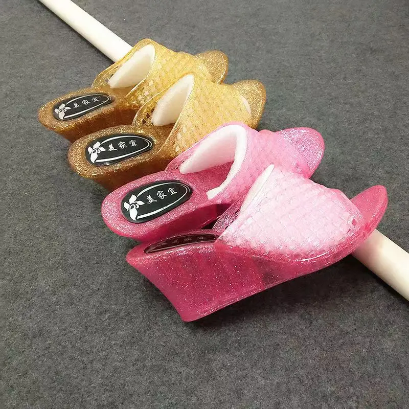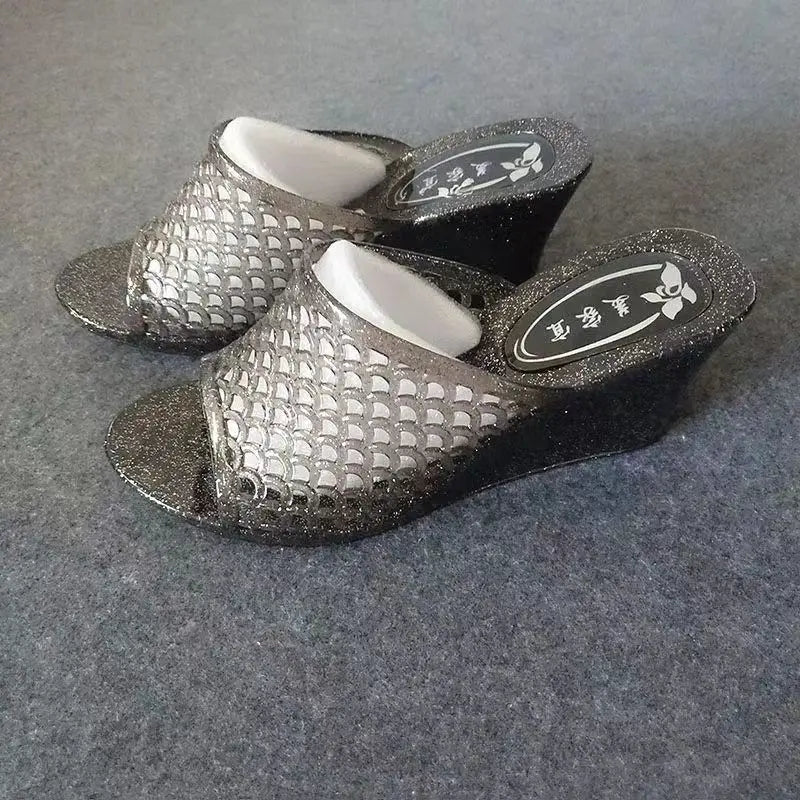 Summer Women's Causal One Word Slippers Soft Bottom Non Slip Slope Heeled Transparent Crystal Home Slippers Bathroom Slippers