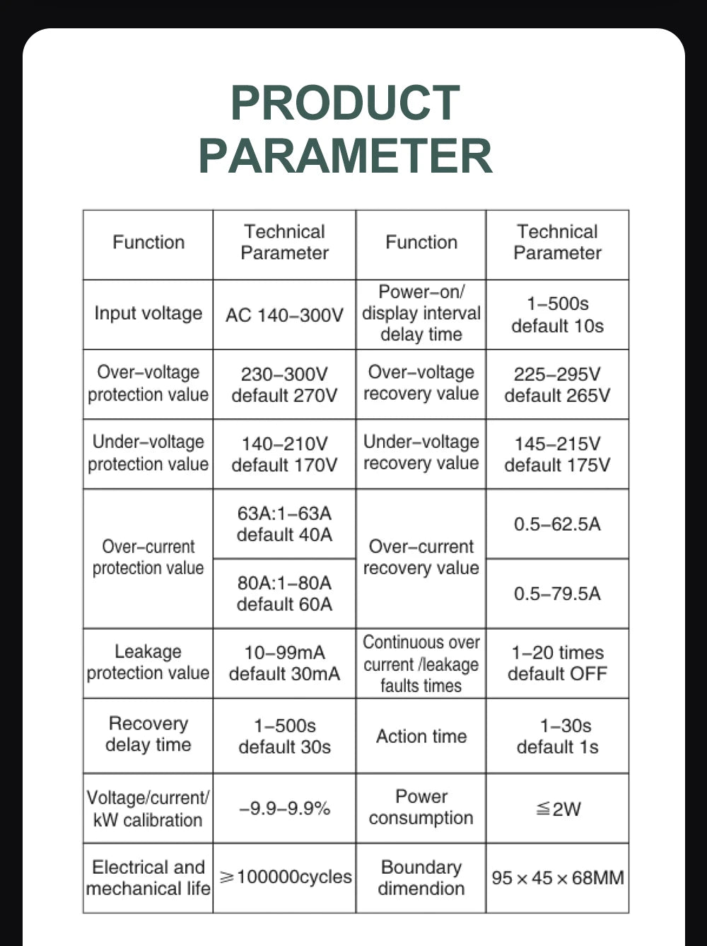 7.Over current protection 1A-63A (adjustable) (default: 40A)