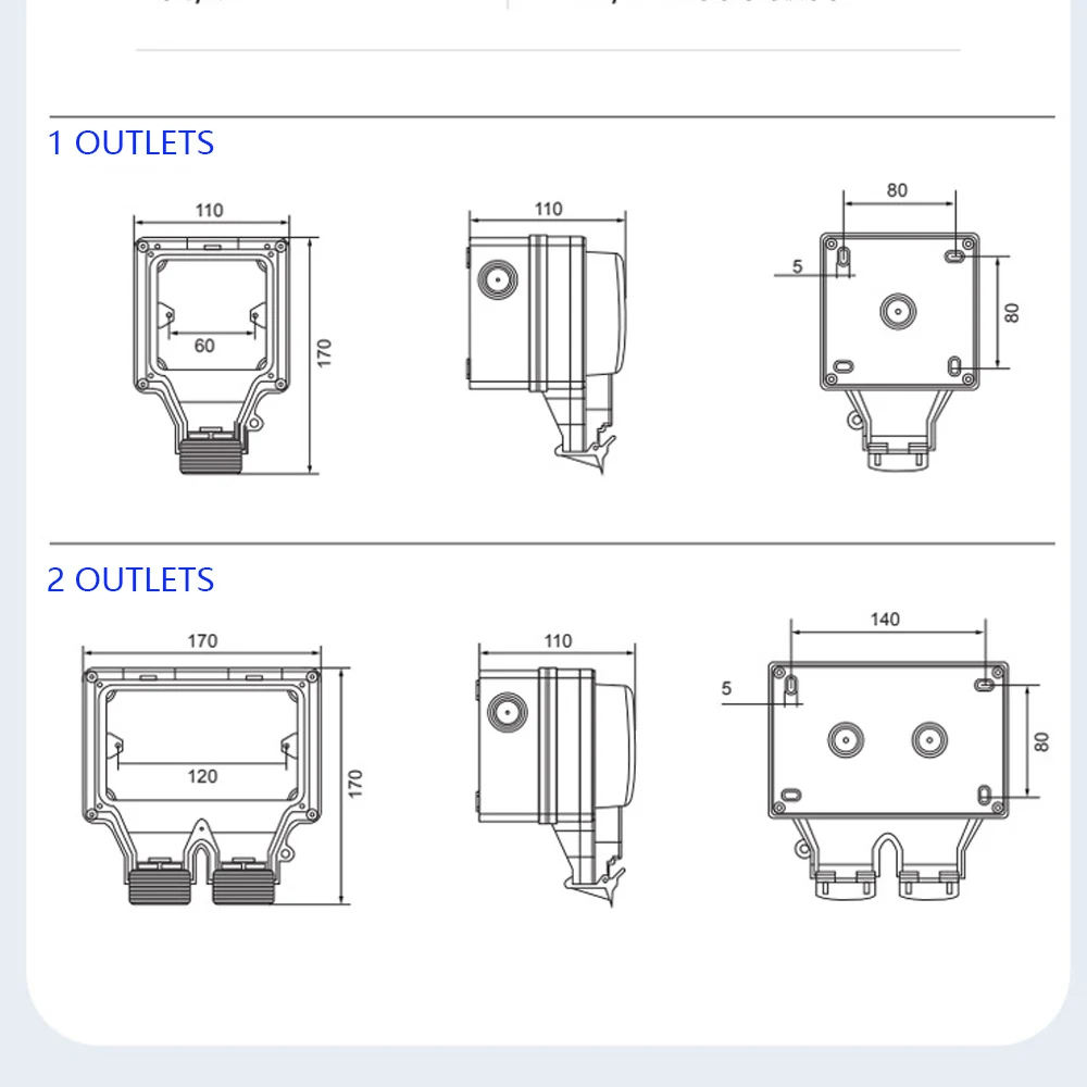 2 outlets: 170 x 170 x 110mm=6.7 x 6.7 x 4.3 inches