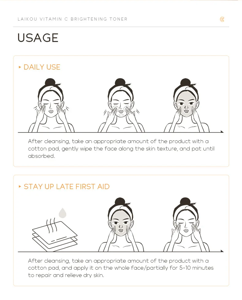 After cleansing, take an appropriate amount of the product with a cotton pad, gently wipe the face along the skin texture, and pat until absorbed.