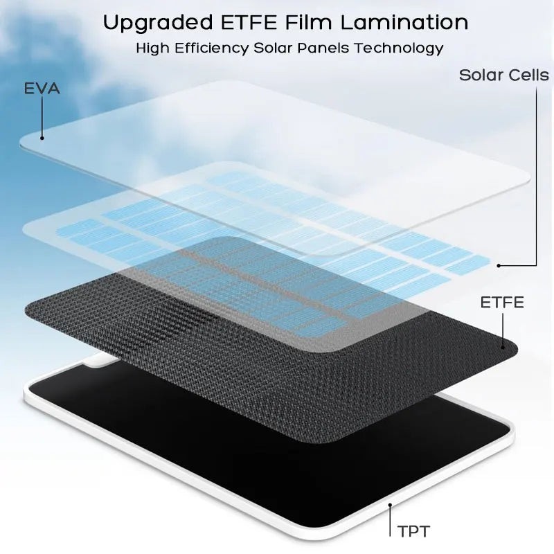 The solar charger is made of high efficiency monocrystalline solar panel which is laminated by ETFE film, which is get more power during the same sunlight condition than normal polycrystalline.