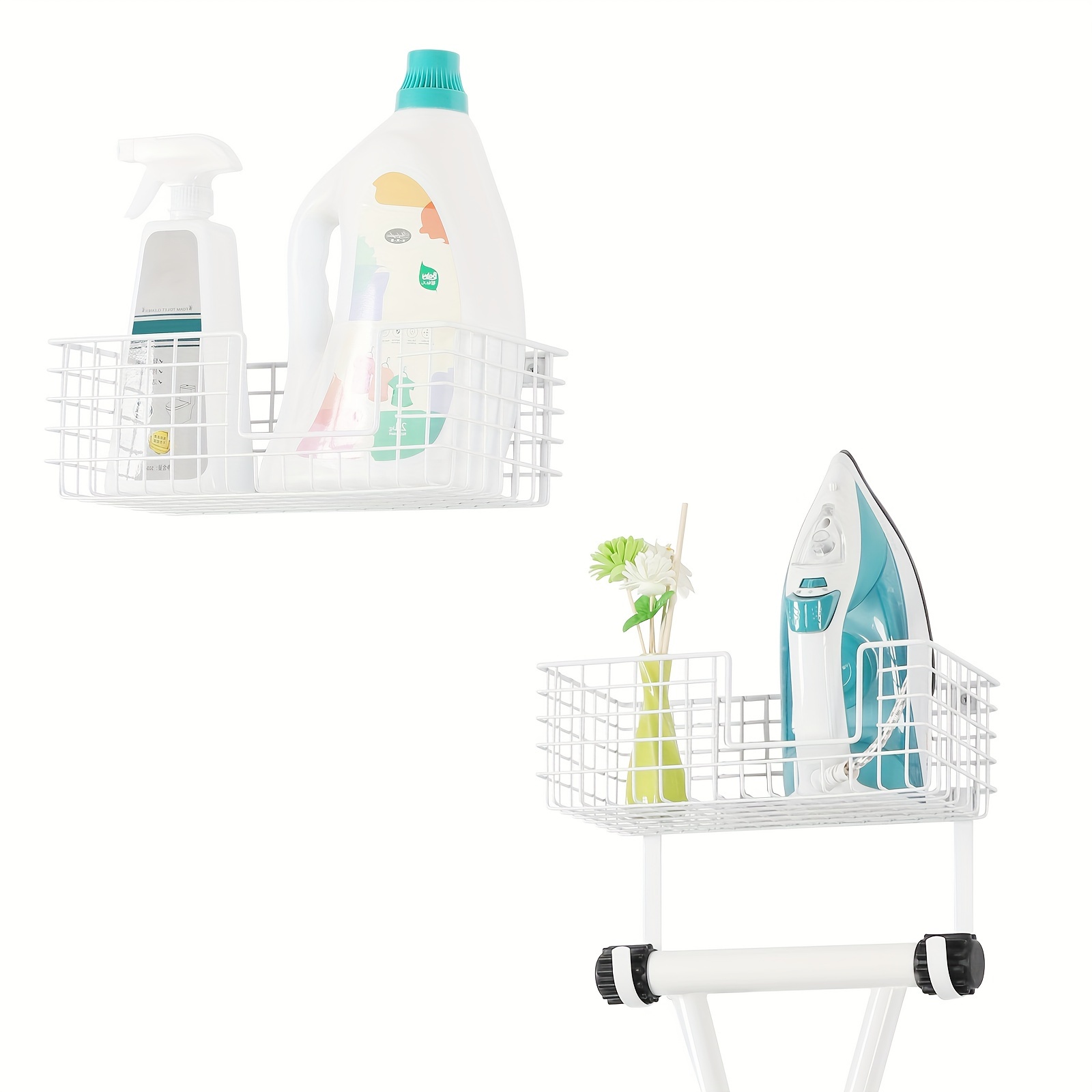 White Wall Mounted Ironing Board Hanger Holder with Storage Baskets Laundry Room Rack Wall Mount Metal Ironing Board Rack with Shelf and Basket for Laundry Room Organization and Storage with 2 Baskets