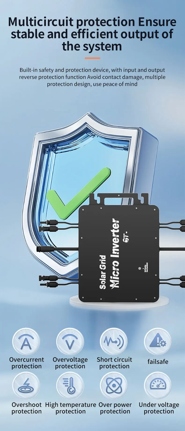Isolated Island Protection, Voltage Protection, Frequency Protection, Temperature Protection, Current Protection, etc. |