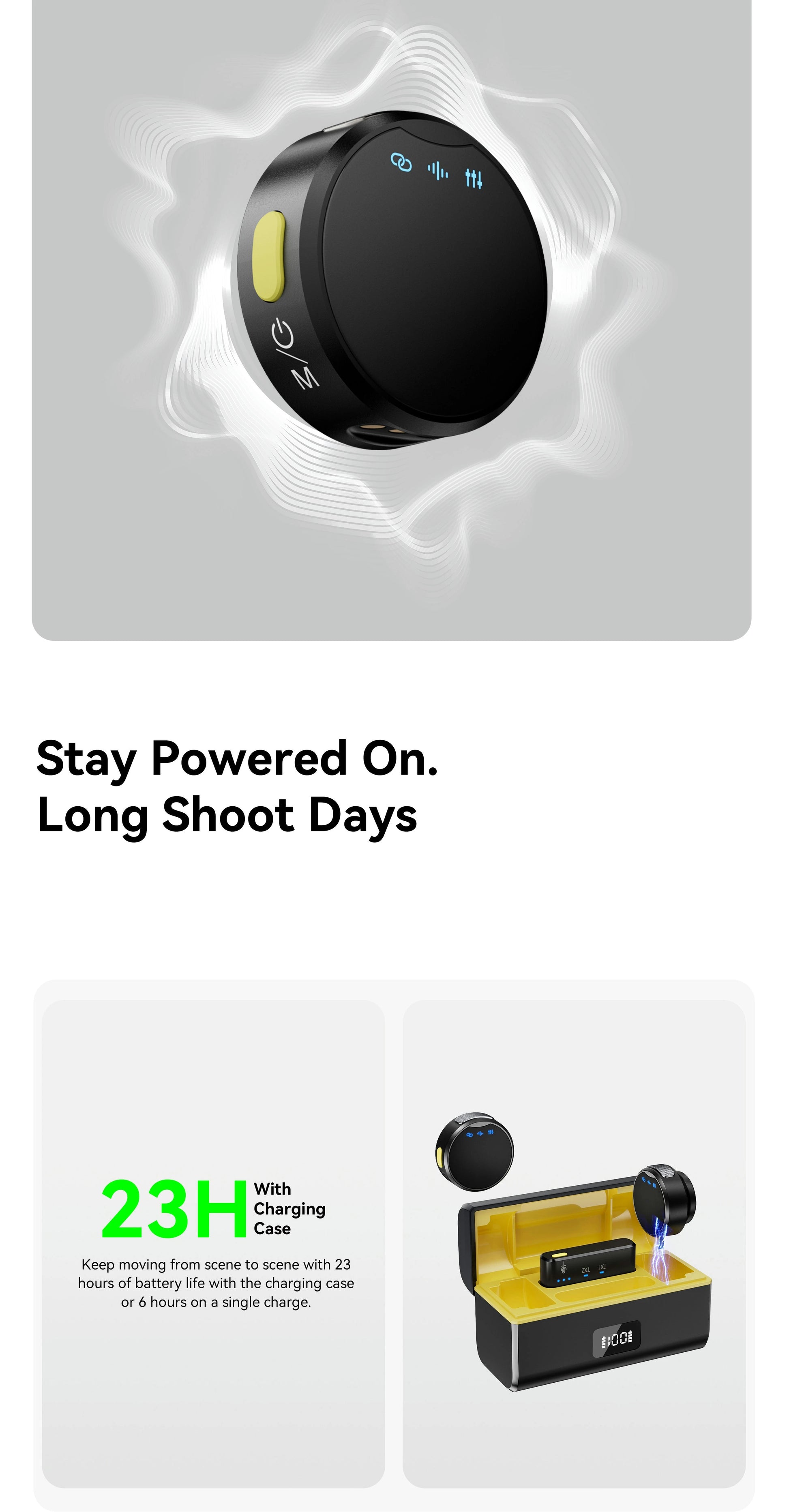 With up to 6 hours of continuous use on a single charge for long recording sessions or live broadcasts, and up to 23 hours of total battery life when paired with the dedicated charging case, you'll be able to show up for any occasion without worrying about running out of power.