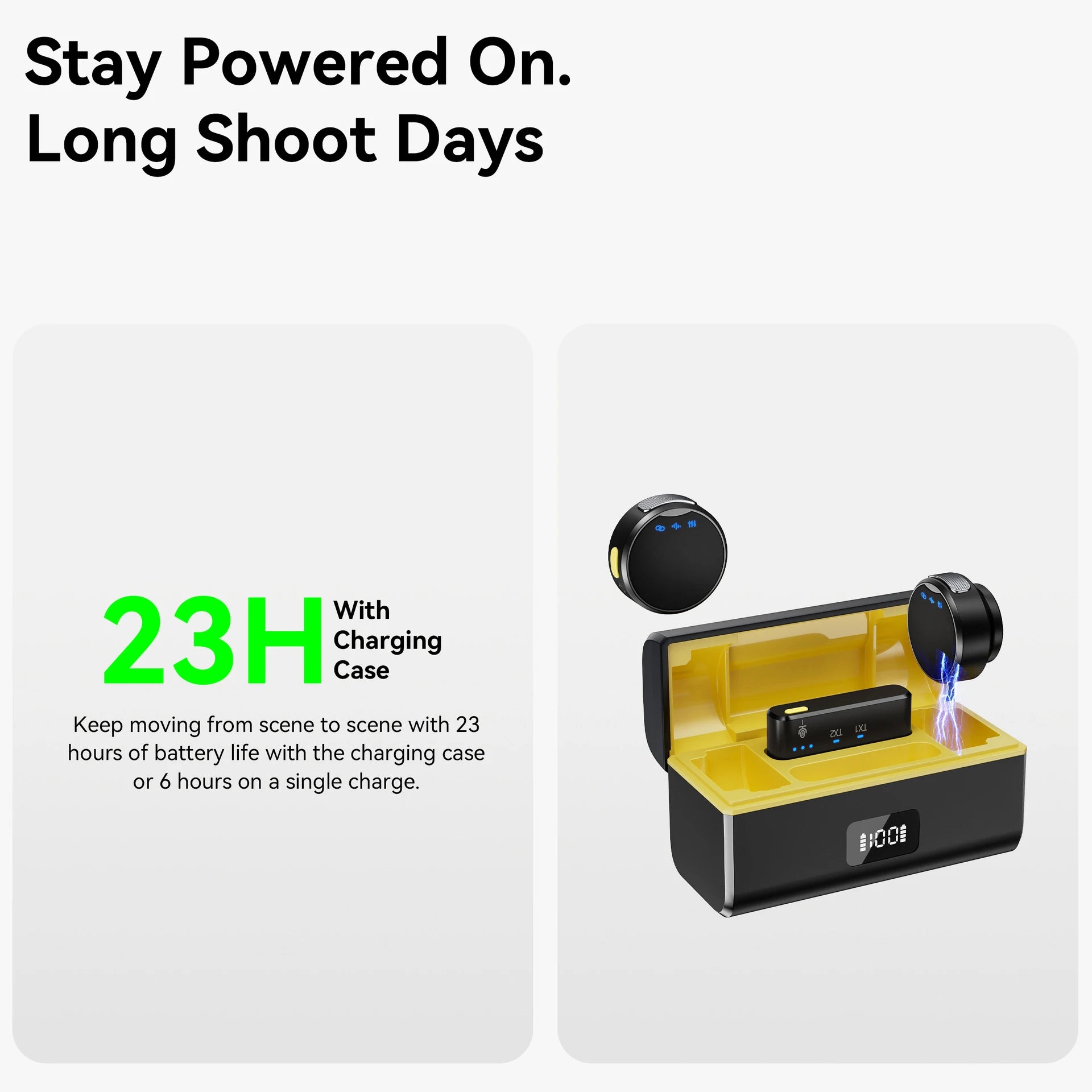 With up to 6 hours of continuous use on a single charge for long recording sessions or live broadcasts, and up to 23 hours of total battery life when paired with the dedicated charging case, you'll be able to show up for any occasion without worrying about running out of power.